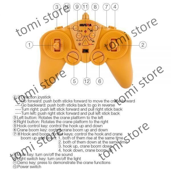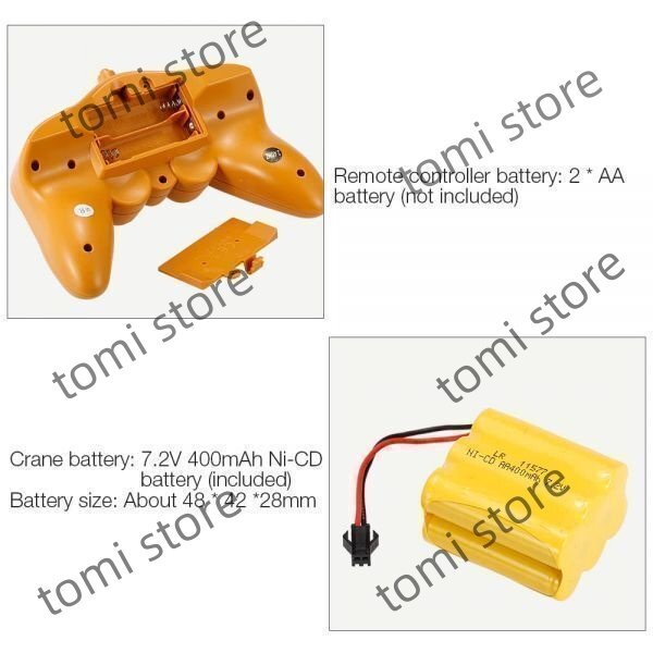 機能:前進/後退、左/右回転、360°回転、アームの上昇/下降、フックアップ/ダウン、ライト&サウンドコントロール、デモ機能