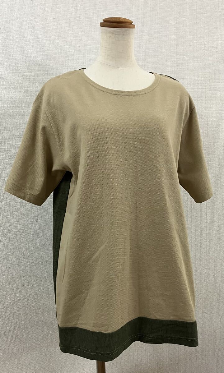 お色はベージュ系と深緑のコットン鹿の子の切替です。流行りのドロップショルダーでゆったりめのサイズ感が着やすい1枚です。お尻も隠れる安心丈です。透け感なし伸縮性あり