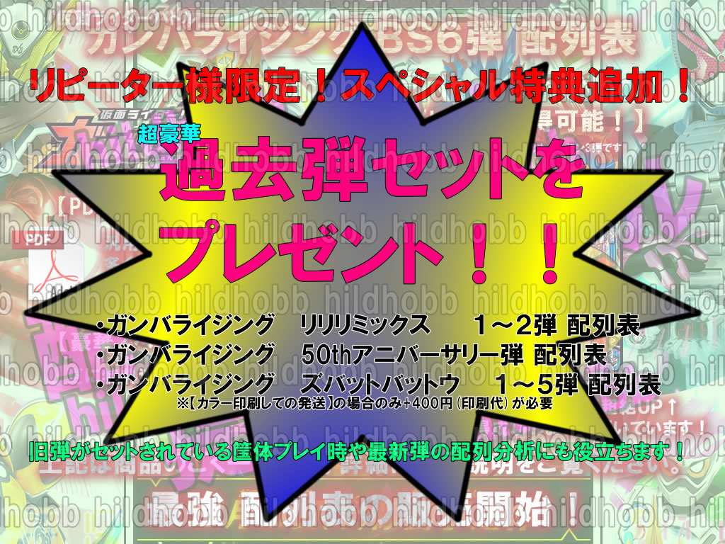 ![]() リピーター様限定!スペシャル特典追加! 超豪華!!過去弾セットをプレゼント!! ・ガンバレジェンズ クロマティックX 1~2弾 配列表 ・ガンバレジェンズ シンクロ神話 1~6章 配列表 ・ガンバレジェンズ 1~5弾 配列表 ※【カラー印刷して発送】の場合のみ+400円(印刷代)が必要 |