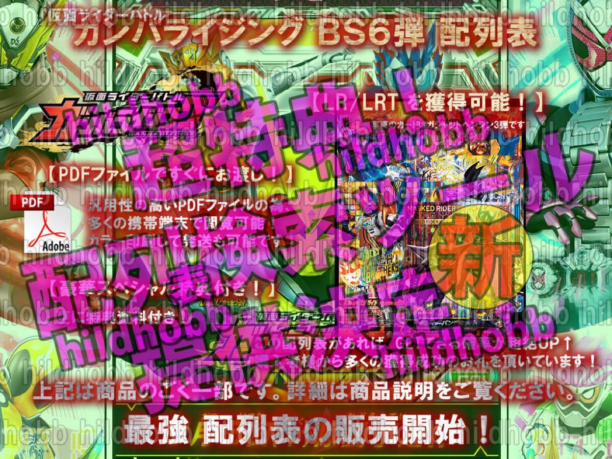 | ◆◆◆商品説明◆◆◆ 仮面ライダーバトル ガンバレジェンズ 最新弾 クロマティックX3弾 配列表検索ツール 毎弾の実績通り、 稼働日[7/24(木)]午前中にサービス開始予定! [新機能] 以下5点の新たな機能を配列表検索ツールに搭載! 1.レアリティ検索 - NやRやSRやCP等のレアリティレベルでも検索が可能となります - 2.過去弾検索 - 過去の弾もシリンダー別に検索が可能となります - 3.ランダム検索 - 排出候補が複数ある場合の箇所にも対応が可能となります - 4.検索履歴 - 過去に検索した内容を閲覧および一括再セット検索が可能となります - 5.更に完全オリジナルの超革新的新機能 - 上記全ての新機能よりも更に革新的なオリジナル新機能を追加します - 今までの配列表検索ツールが上記の新機能の搭載により、劇的にパワーアップします! 【配列表検索ツール ガンバレジェンズ クロマティックX3弾】 配列表検索ツールは、排出されたカード番号を入力するだけで、 瞬時に一致する配列表の箇所を検索し、次のLLR、LRが排出されるまでの回数を表示します。 当ツールはスマートフォン端末やタブレット端末での操作となりますので、筺体の前で配列表を広げたり配列表と何分間もにらめっこする必要が無くなります。 非常に直感的なツールですので特に説明も必要なく簡単に操作することが可能です。 また転売対策にも大きな役割を果たします。こちらが作成した配列表の転売行為により、 落札者様から『段々と同じ配列表を持っている人が多くなって既にLLR、LRが抜かれた後の事が増えてきた』といった声が多く聞かれるようになってきました。 悪質な転売行為により、出品者だけではなく落札者様の利益にまで影響が出る深刻な事態となっていました。 当ツールは転売や盗作を阻止する機能を搭載しておりますので、可能な限り落札者様の利益をも確保することができる最良の環境構築を実現しております。 過去毎弾、最多パターン及び最速配信を実現してきた当方だけが唯一提供できるWEBツール商品です。 購入希望者様は今まで以上に、こちらの配列表の転売品や模倣したツール商品の購入にご注意下さい。 【実績】 CX2弾 12パターン CX1弾 12パターン SC6章 12パターン SC5章 12パターン SC4章 12パターン SC3章 12パターン SC2章 12パターン SC1章 12パターン GL5弾 12パターン GL4弾 12パターン GL3弾 12パターン GL2弾 12パターン GL1弾 12パターン GG3弾 12パターン GG2弾 12パターン GG1弾 12パターン その他の過去弾も全て最多パターン その為、今後はPDFファイルやネットプリントよりも、優先してサービスを提供する予定です。 ※PDFファイルやネットプリントに関しましても、今まで通り最多と最速でお渡し予定なのでご安心下さい。当ツールではそれよりも更に優先する可能性があるということです また、当ツールへの完全移行も視野にいれておりますので、是非、スタート間もないこの機会に使いこなして差を付けて下さい。 今後も更なる充実した機能や当方にしかできない驚きの新機能を続々と実装予定ですので、そちらもまた楽しみにして下さい。 今までの完成度の高いPDFファイル形式に慣れ過ぎ、実際に試しもしないで当ツールを拒否することは、非常に損だと断言します。 |
