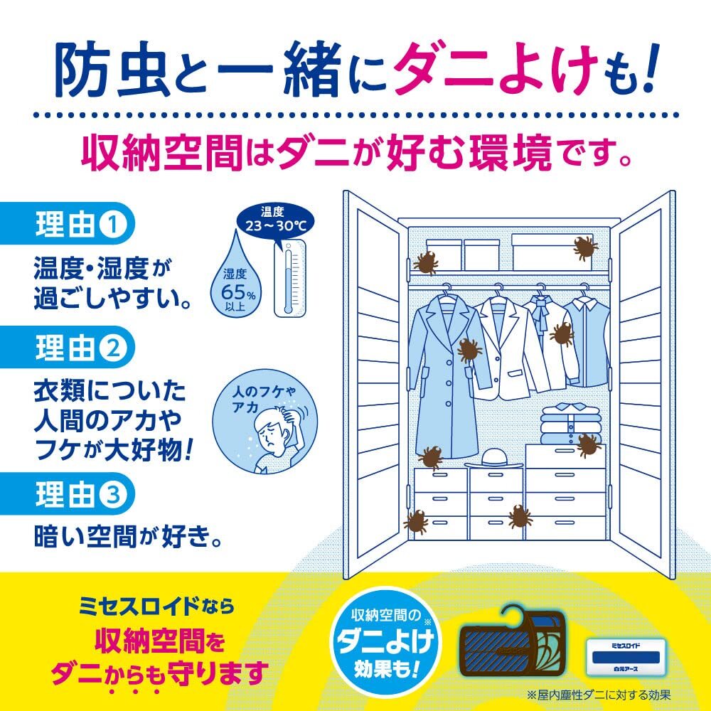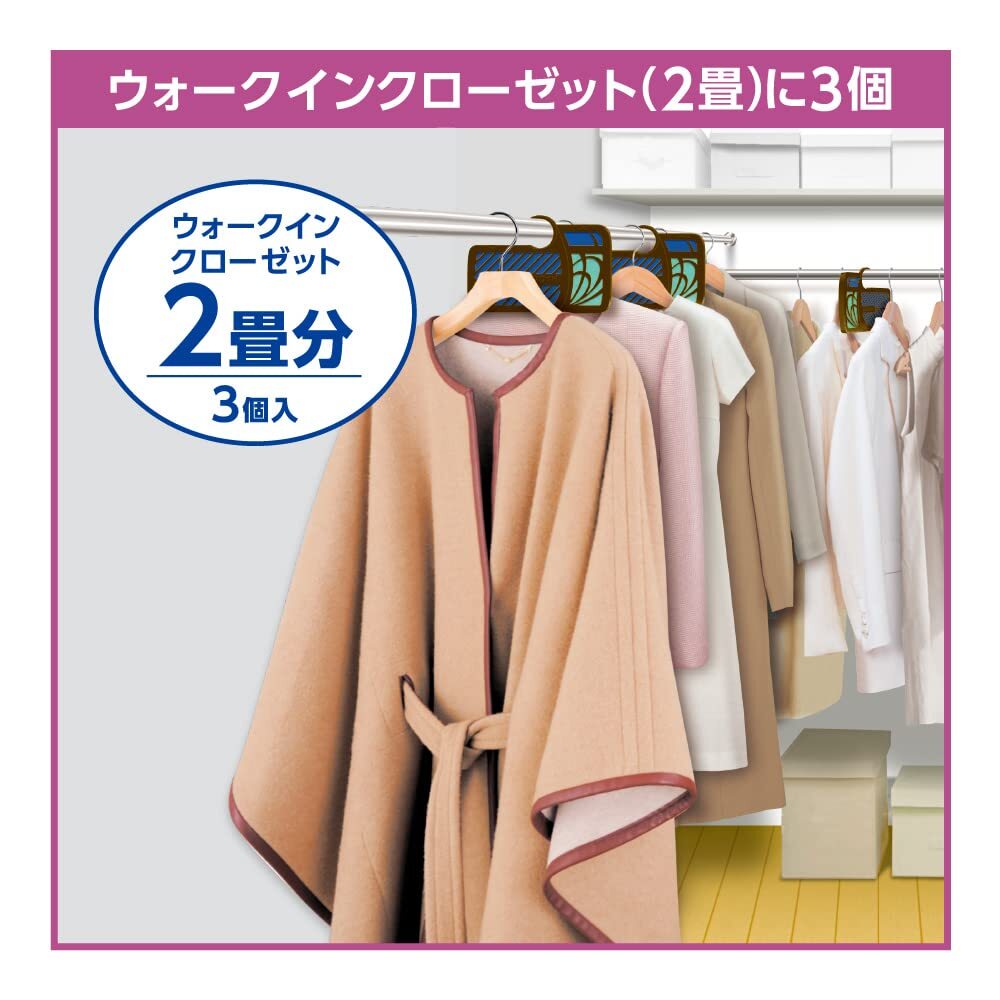 説明 商品紹介 【商品の特長】 ●ニオイがつかない防虫成分が大切な衣類をせんいの虫から守ります。 ●消臭成分配合。収納空間の気になるニオイ(カビ臭・汗臭・体臭)を消臭します。 ●黄ばみ防止成分配合。衣類保管時の窒素酸化物(NOx)による黄ばみを防ぎます。※汚れが原因の黄ばみには効果がありません。※黄ばみを消す効果はありません。※素材、生地によって効果は異なります。 ●せんいの防虫に加え、気になるダニを収納空間内に寄せつけにくくします。(ピレスロイドの効果)※収納空間内に屋内塵性ダニを寄せつけにくくする効果を確認しています。※マダニやイエダニを対象とした製品ではありません。 ●取り替え時期がひと目で分かる「おとりかえサイン」付きです。 ●金糸、銀糸、ラメ加工製品、ボタン類(金属、プラスチック製品)などにも安心して使えます。 ●和服、毛皮等の皮革製衣類にも使えます。 使用上の注意 【使用上の注意】 ●パッケージに記載されている使用量を守ってご使用ください。 ●衣類の入れ替えをする時は、部屋の換気を行ってください。 ●幼児の手のとどく所に置かないでください。 ●ウォークインクローゼット等の扉は閉めて、密閉性のある直射日光の当たらない収納空間でご使用ください。 ●本品は食べられません。万一食べた時には医師にご相談ください。 ●誤食等の対応のため、商品の使用中は箱を保管してください。 ●用途以外には使用しないでください。 ●本品はプラスチックゴミです。使用後は地方自治体の区分に従って捨ててください。 【収納前の注意】 ●衣類の汚れをきちんと落としてください。 ●衣類をよく乾燥させてください。 ●クリーニングのカバー等は外してください。 【使用方法】 ●袋から取り出し、ウォークインクローゼット(容量7 800Lの場合)のパイプに3個吊り下げてください。(収納空間で等間隔に吊るすと効果的です。) ●〈おとりかえください〉の白い文字が出たら、香りが残っていてもお取り替えください。 【保存方法】 ●密封して温度の低い直射日光の当たらない所に保存してください。 【成分】 ●プロフルトリン(ピレスロイド系)、エンペントリン(ピレスロイド系)、鉱物系吸着剤(消臭成分・黄ばみ防止成分)、香料 【適用害虫】 ≪せんいの防虫効果≫ ●イガ、コイガ、ヒメカツオブシムシ、ヒメマルカツオブシムシ ≪収納空間のダニよけ効果≫ ●屋内塵性ダニ 【有効期間】 ●使用開始後 約(防虫効果)※温度、収納空間、使用状態などで有効期間は一定しません。※「おとりかえサイン」のでかたは季節や収納状態によって異なる場合があります。 【標準使用量】 ●幅180cm×高さ240cm×奥行180cm(=7 800L)のウォークインクローゼットに3個 【内容量】 ●3個 使用方法 【使用上の注意】 ●パッケージに記載されている使用量を守ってご使用ください。 ●衣類の入れ替えをする時は、部屋の換気を行ってください。 ●幼児の手のとどく所に置かないでください。 ●ウォークインクローゼット等の密閉性のある直射日光の当たらない収納空間でご使用ください。 ●本品は食べられません。万一食べた時には医師にご相談ください。 ●塩化ビニル製のバッグ、スチロール製のひな人形、アクリル製のブローチ等の合成樹脂製品は、 本剤におかされ変形することがあります。 ●保管環境により防虫剤本体に成分が染み込み透明になる場合がありますが、そのままご使用いただけます。 ●誤食等の対応のため、使用中はこの箱を保管してください。 ●用途以外には使用しないでください。 ●本品は紙ゴミです。使用後は地方自治体の区分に従って捨ててください。 【有効期間】 ●使用開始後 約1年間(防虫効果) ●温度、収納空間、使用状態などで有効期間は一定しません。