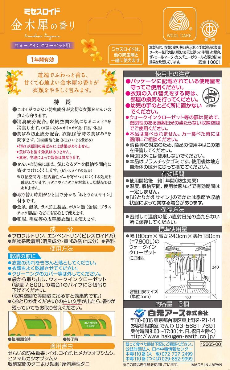 ミセスロイド ウォークインクローゼット用 3個入 1年防虫 金木犀の香り 防虫剤