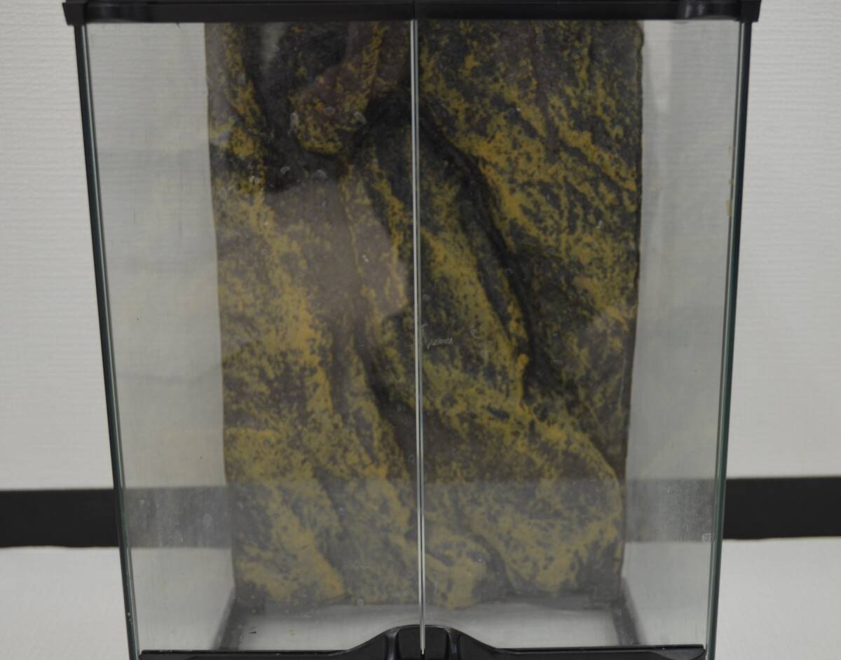 日常のメンテナンスやエサやりがしやすい前面開閉式ドア。付属のバックグラウンドがリアルの岩肌を再現。