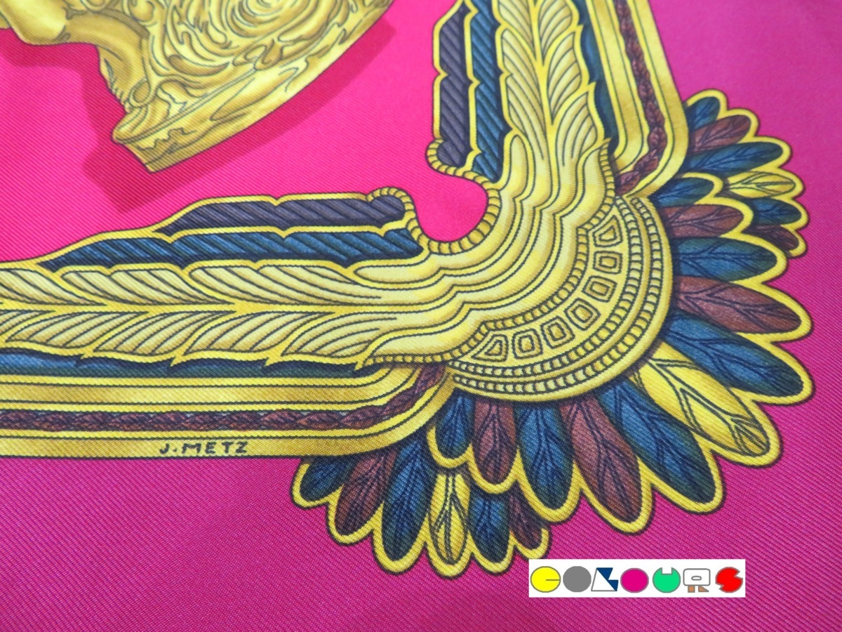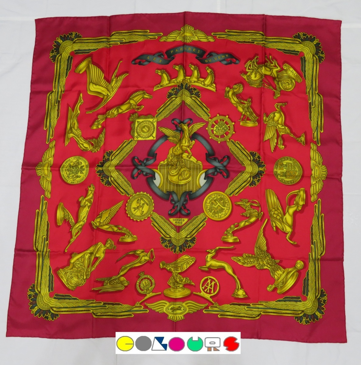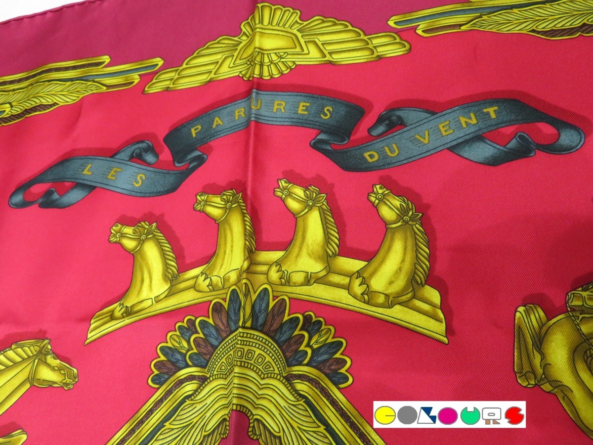 〔COLOURS〕 美品■カレ90■LES PARURES DU VENT■シルク■大判スカーフ■深紅×ゴールド■HERMES