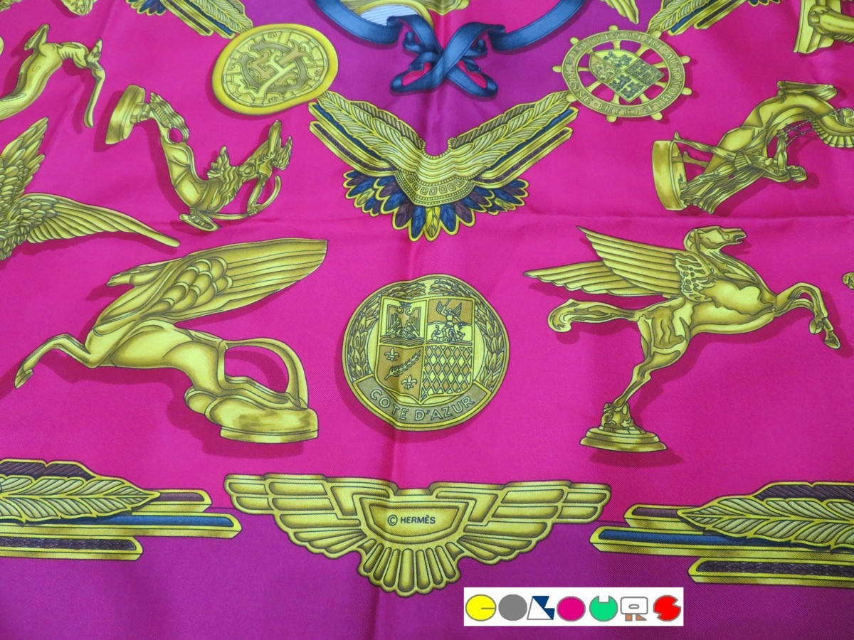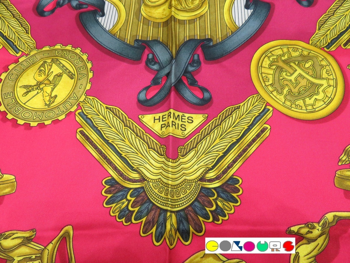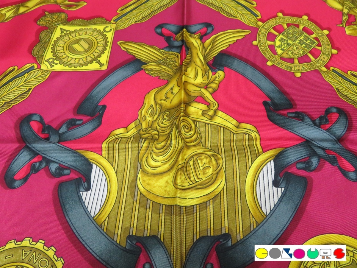 〔COLOURS〕 美品■カレ90■LES PARURES DU VENT■シルク■大判スカーフ■深紅×ゴールド■HERMES