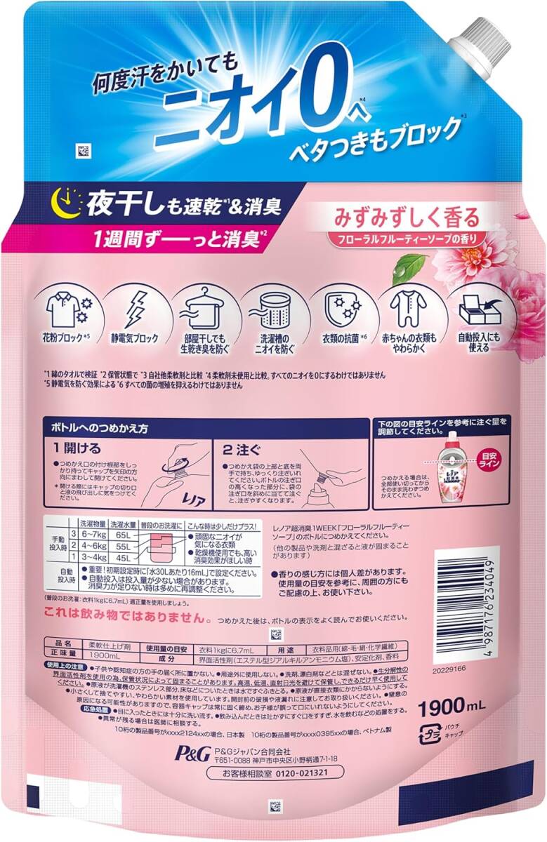 【ケース売り】レノア 超消臭1WEEK 柔軟剤 フローラルフルーティーソープ 詰め替え 1,900mL×6袋