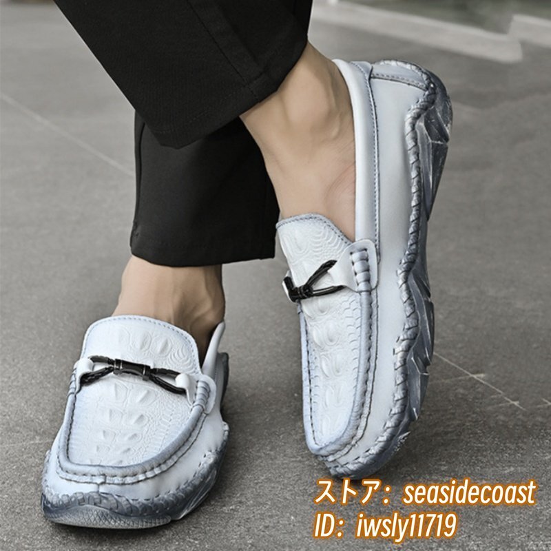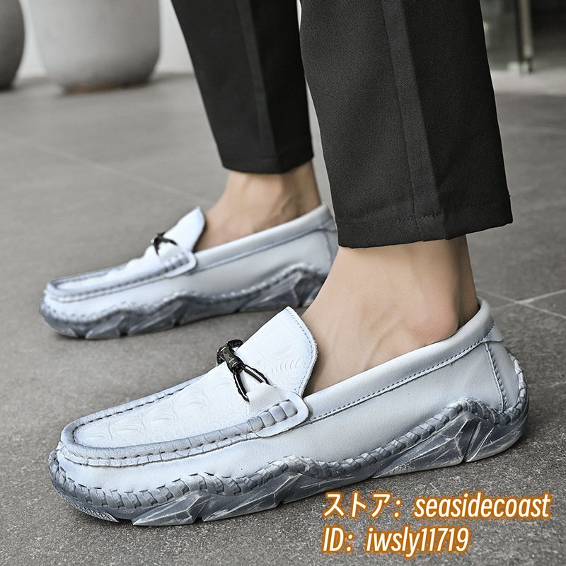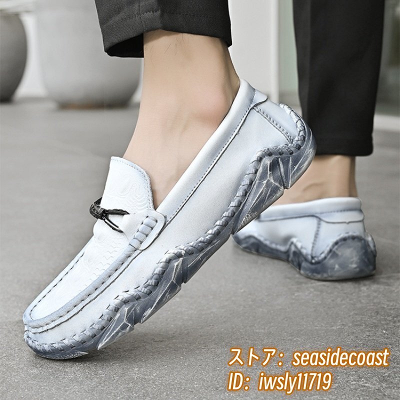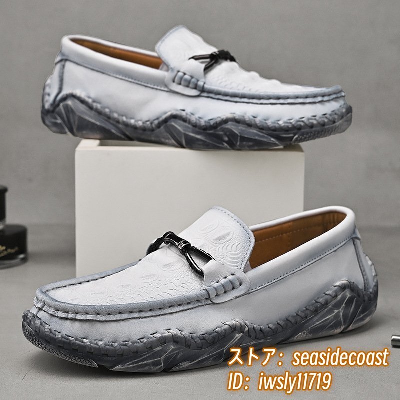 超美品★本革 ローファー スリッポン 新品 メンズ レザーシューズ 牛革 ビジネスシューズ ドライビングシューズ 紳士靴 白/灰 25.5cm