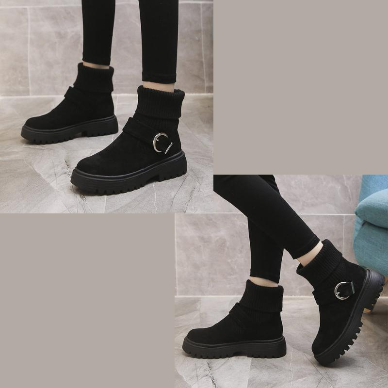 華奢な足首を引き立てるスリムシルエットの厚底ショートブーツ。