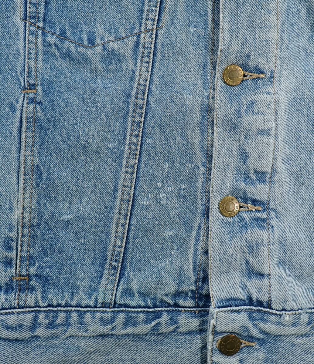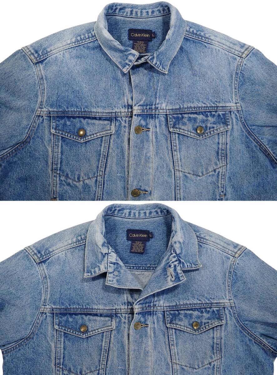 備考 ファーストライン、Calvin Kleinのデニムジャケットです。ポケットと袖口カフスの上はスナップボタン、刻印入りボタン。色落ち具合や細かなダメージが良い雰囲気になっていると思います。クリーニング、プレス済。