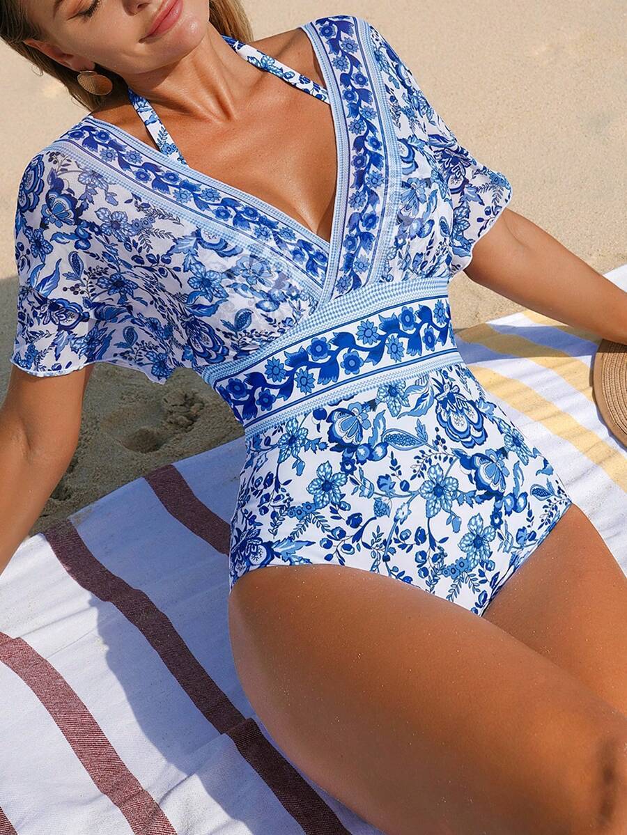 レディース 水着 ワンピース 女性用 ブルー&ホワイト 中国風ボヘミアン メッシュ腹部補正ワンピース水着