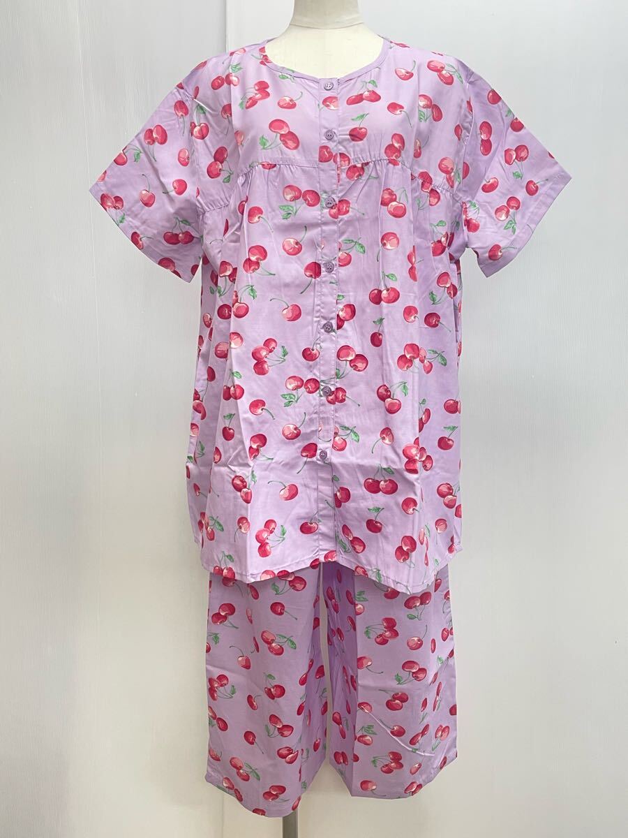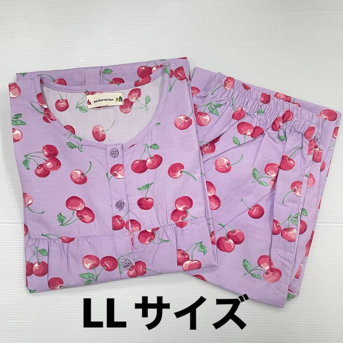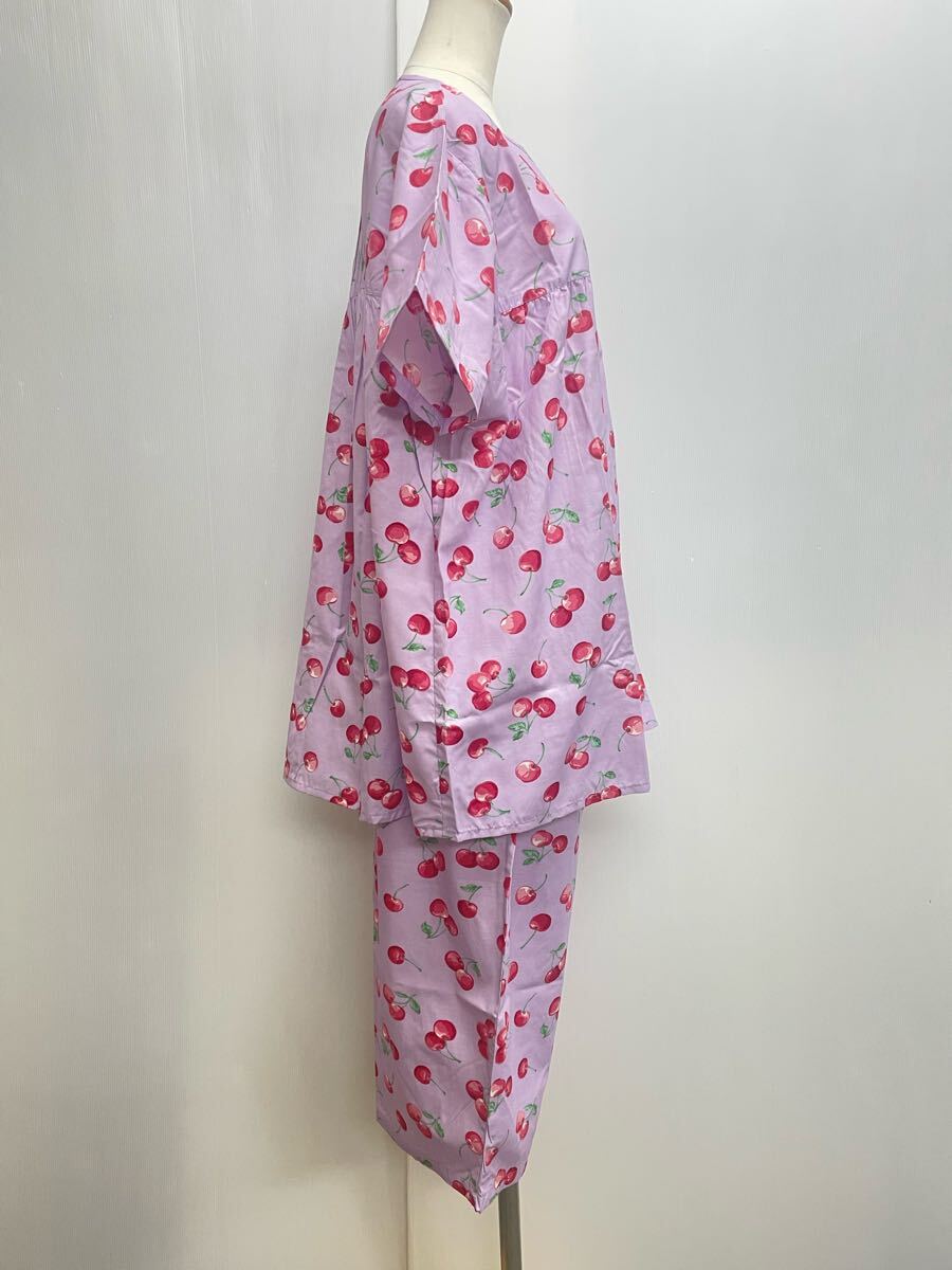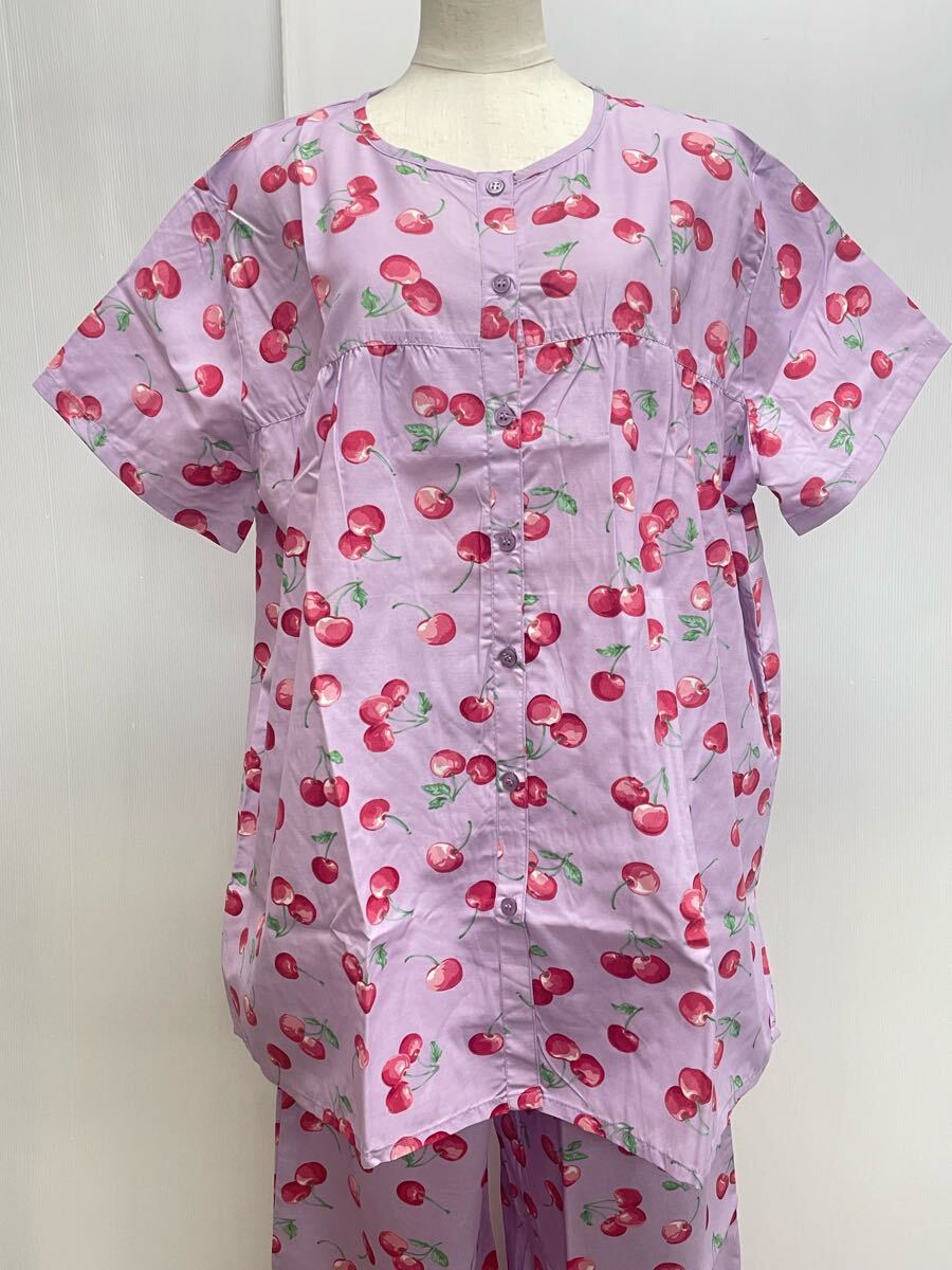 新品63946ラベンダー LLサイズ チェリー柄ゆったり半袖パジャマ 8分丈パンツ 綿混素材 さくらんぼ柄 レディースパジャマ ルームウエア大寸