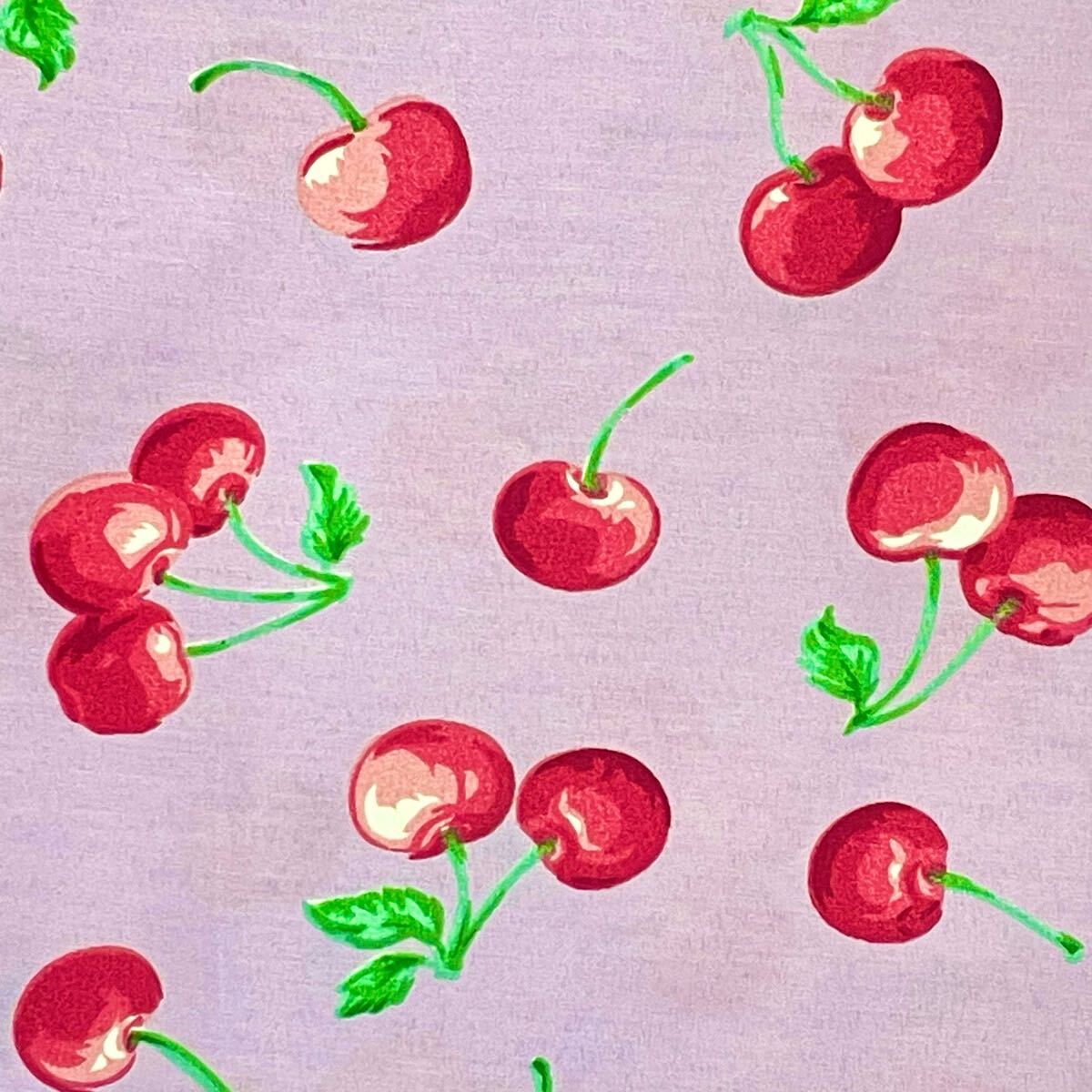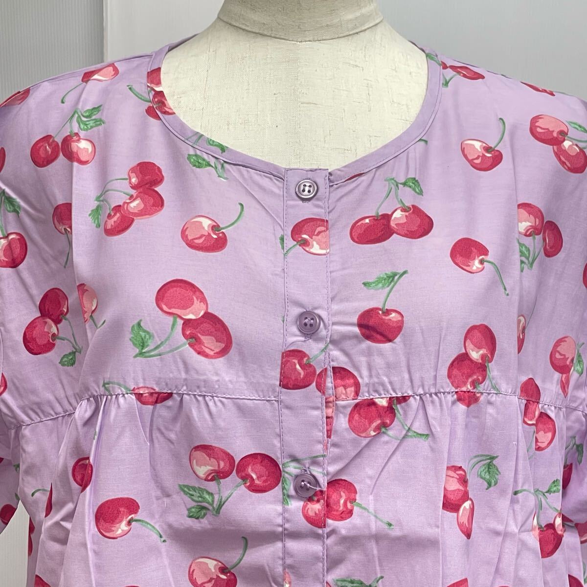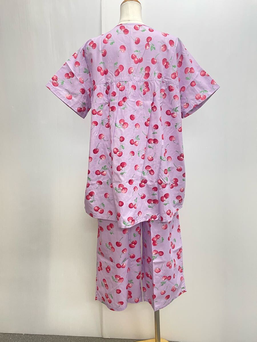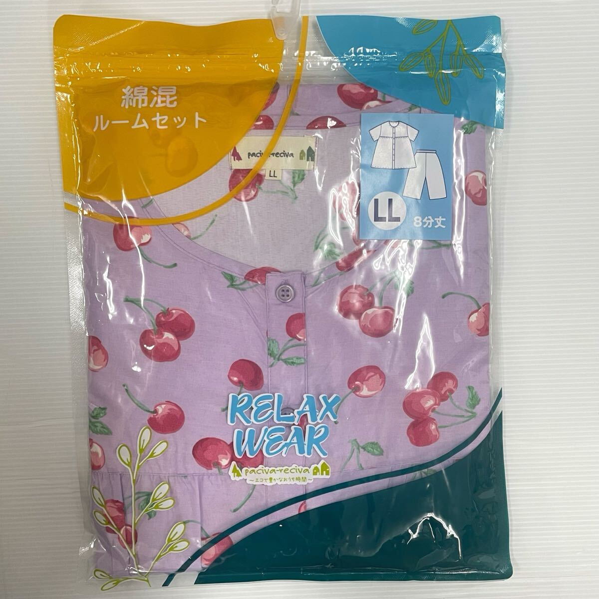 新品63946ラベンダー LLサイズ チェリー柄ゆったり半袖パジャマ 8分丈パンツ 綿混素材 さくらんぼ柄 レディースパジャマ ルームウエア大寸