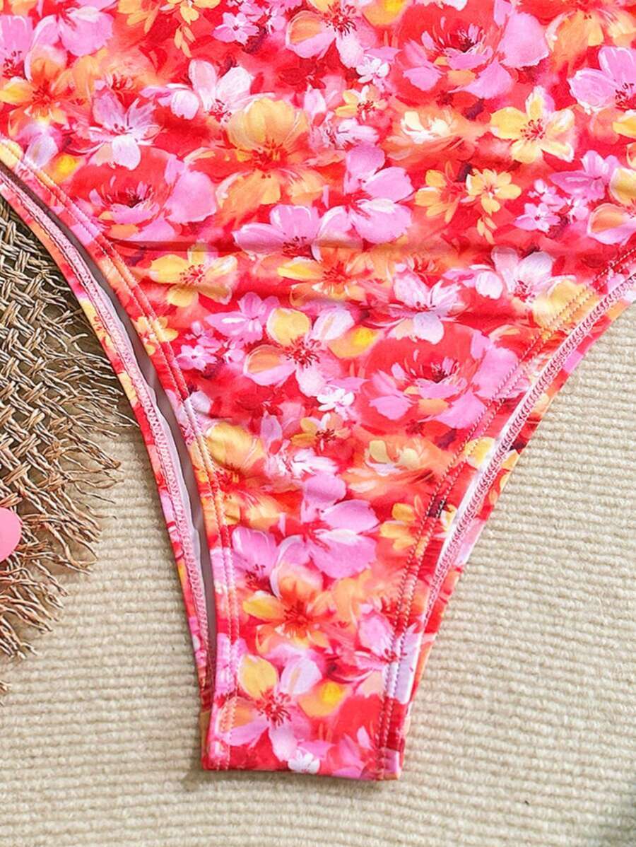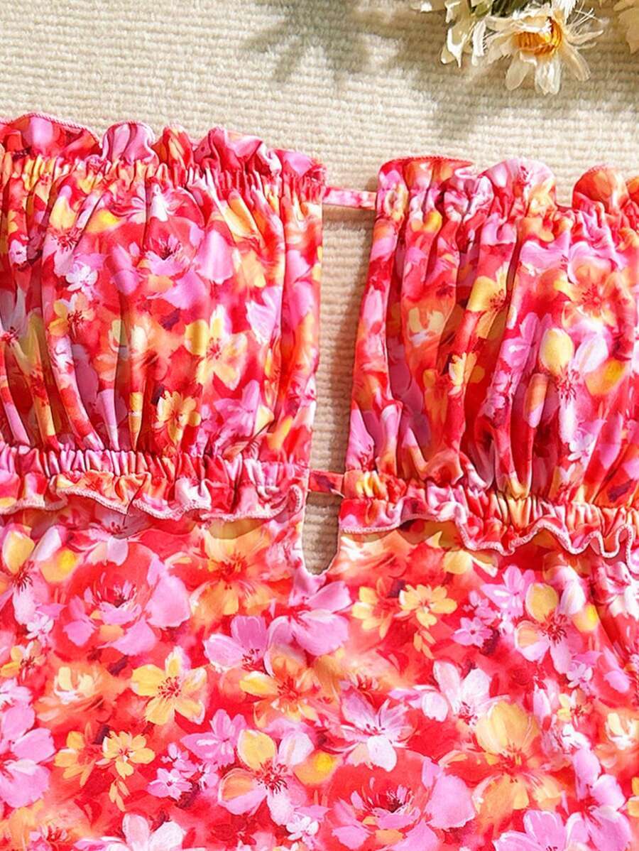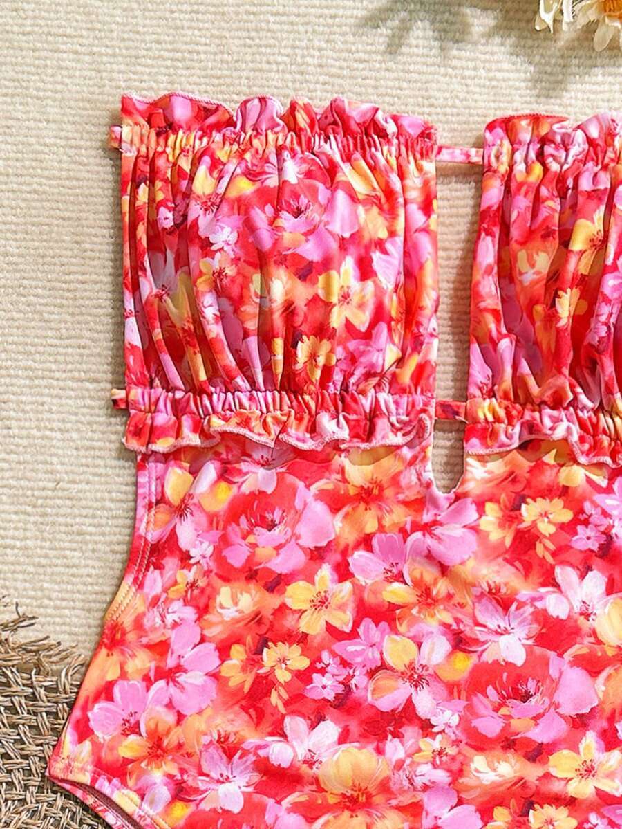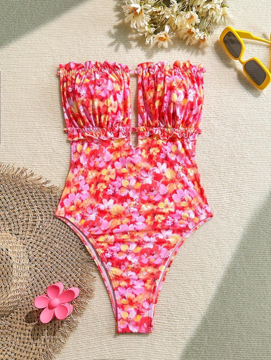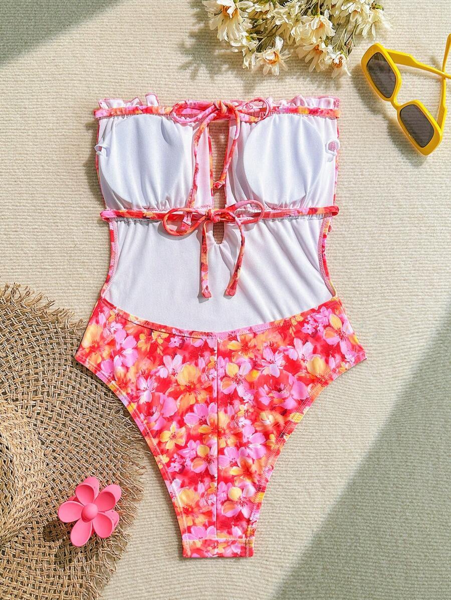 レディース 水着 ワンピース バカンス レディース スウィート フローラル プリント ストラップレス ラッフル トリム ホールアウ