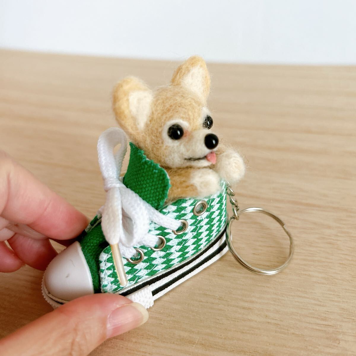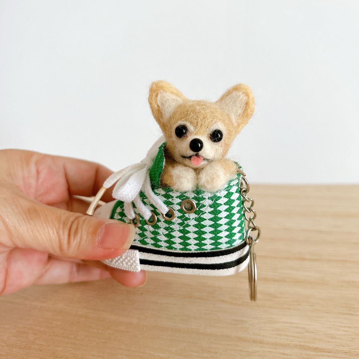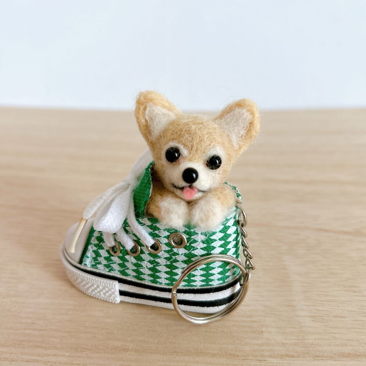 ハンドメイド 羊毛フェルト クリーム チワワ スニーカー キーホルダー マスコット ぬいぐるみ 犬 雑貨 癒しグッズ ペットロス ギフト