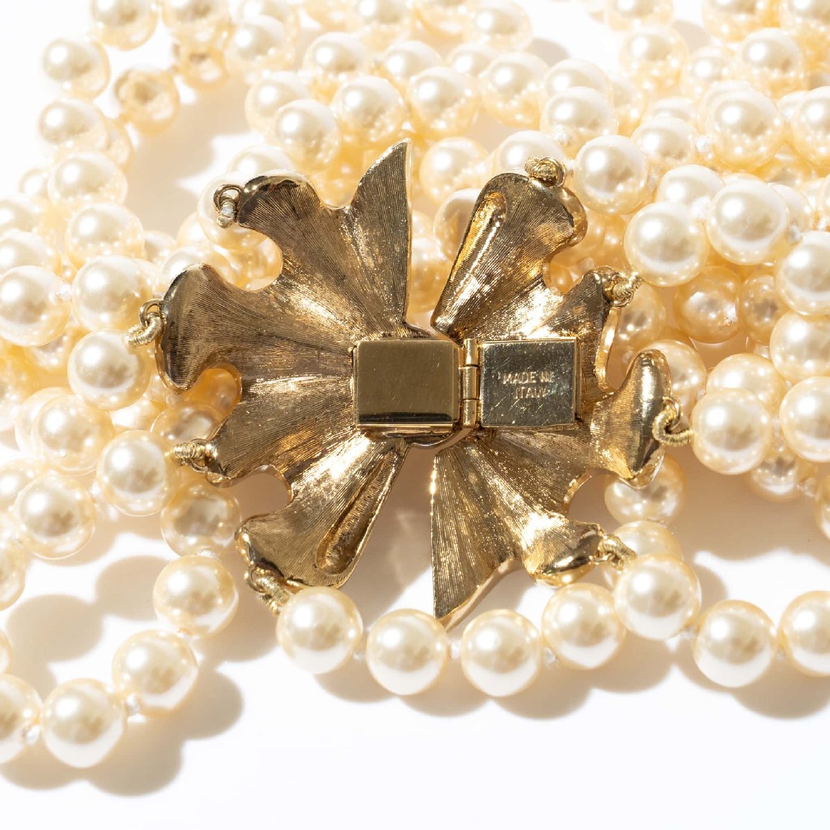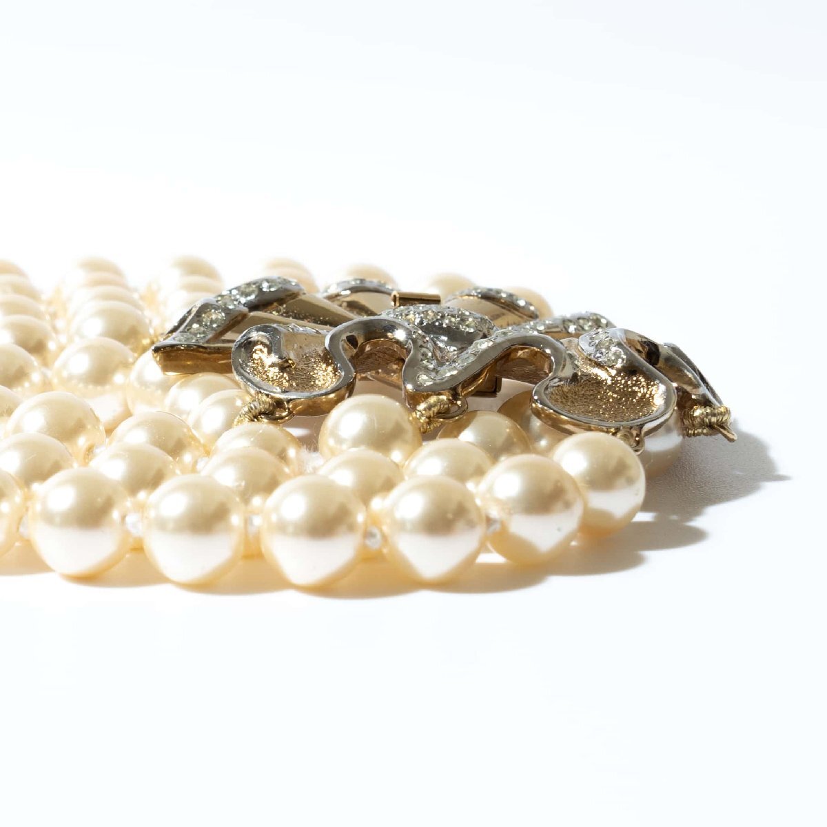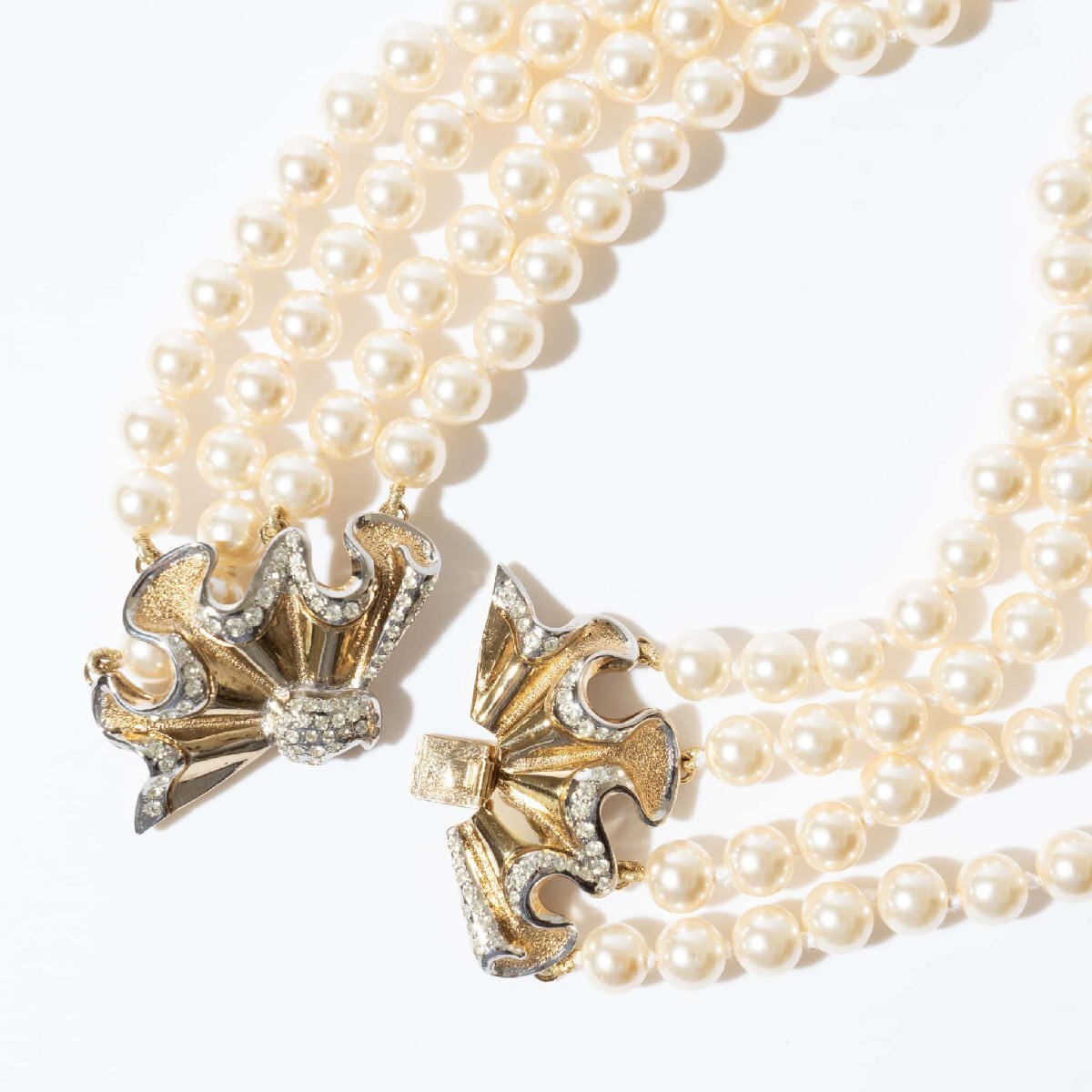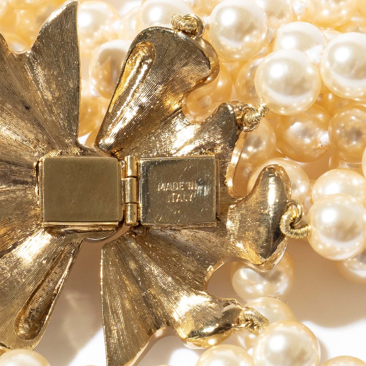 留め具部分のメタル装飾がリボンを表現しているゴージャスな4連のフェイクパールヴィンテージネックレス。
