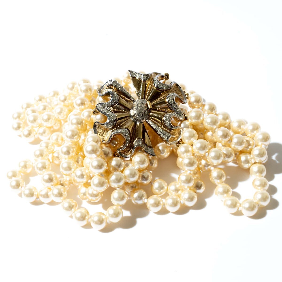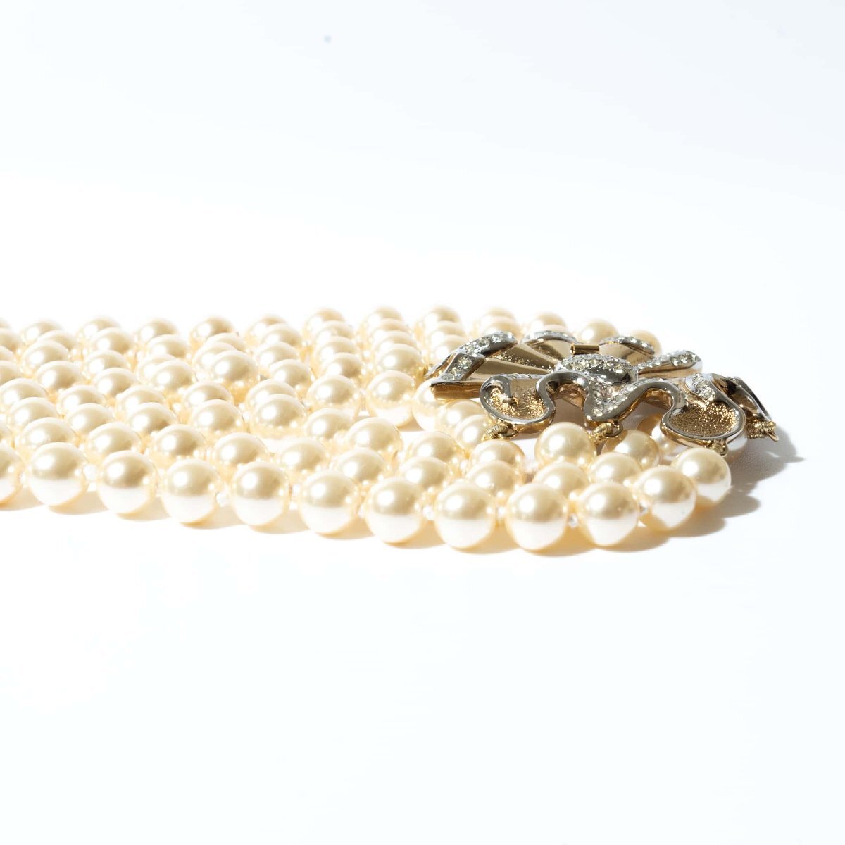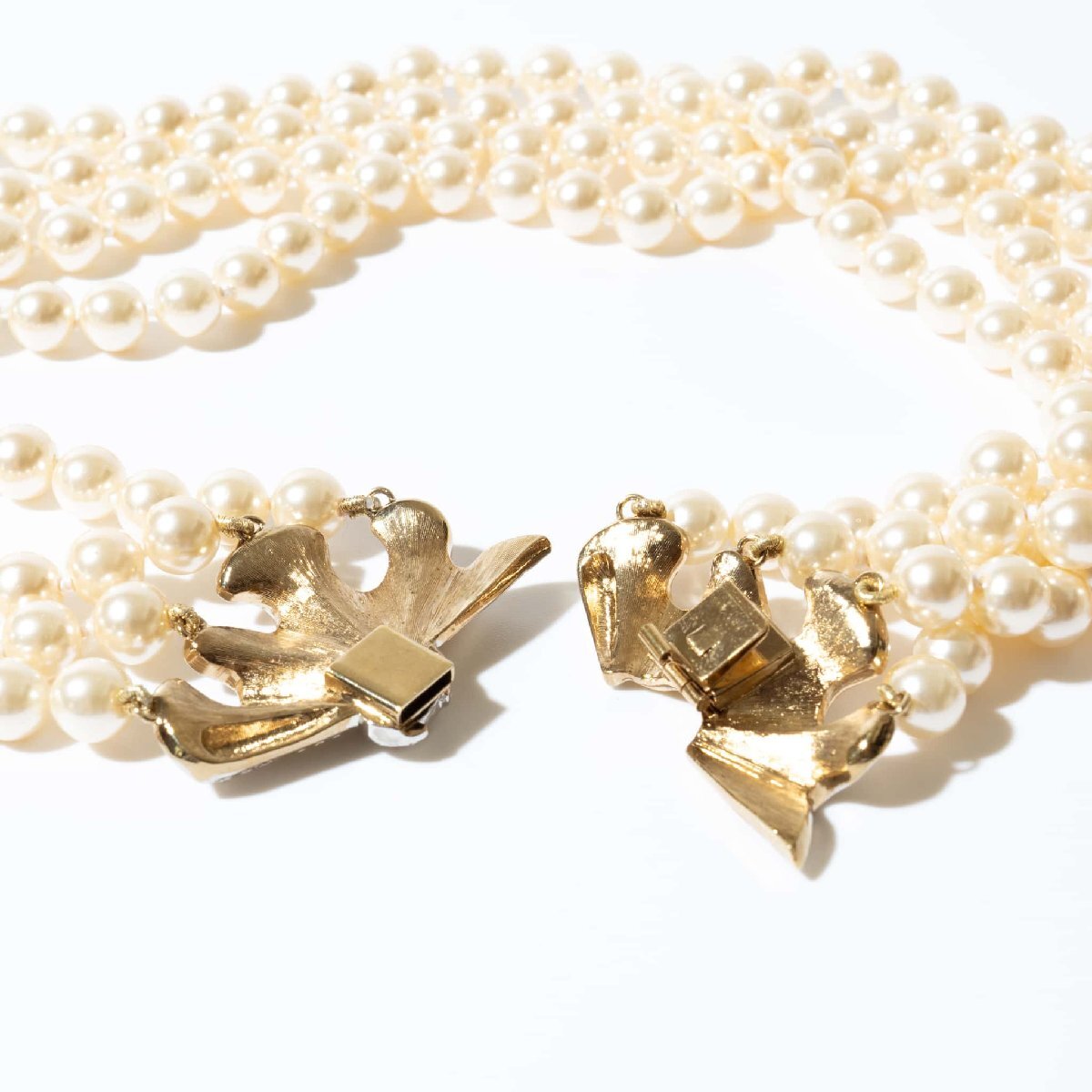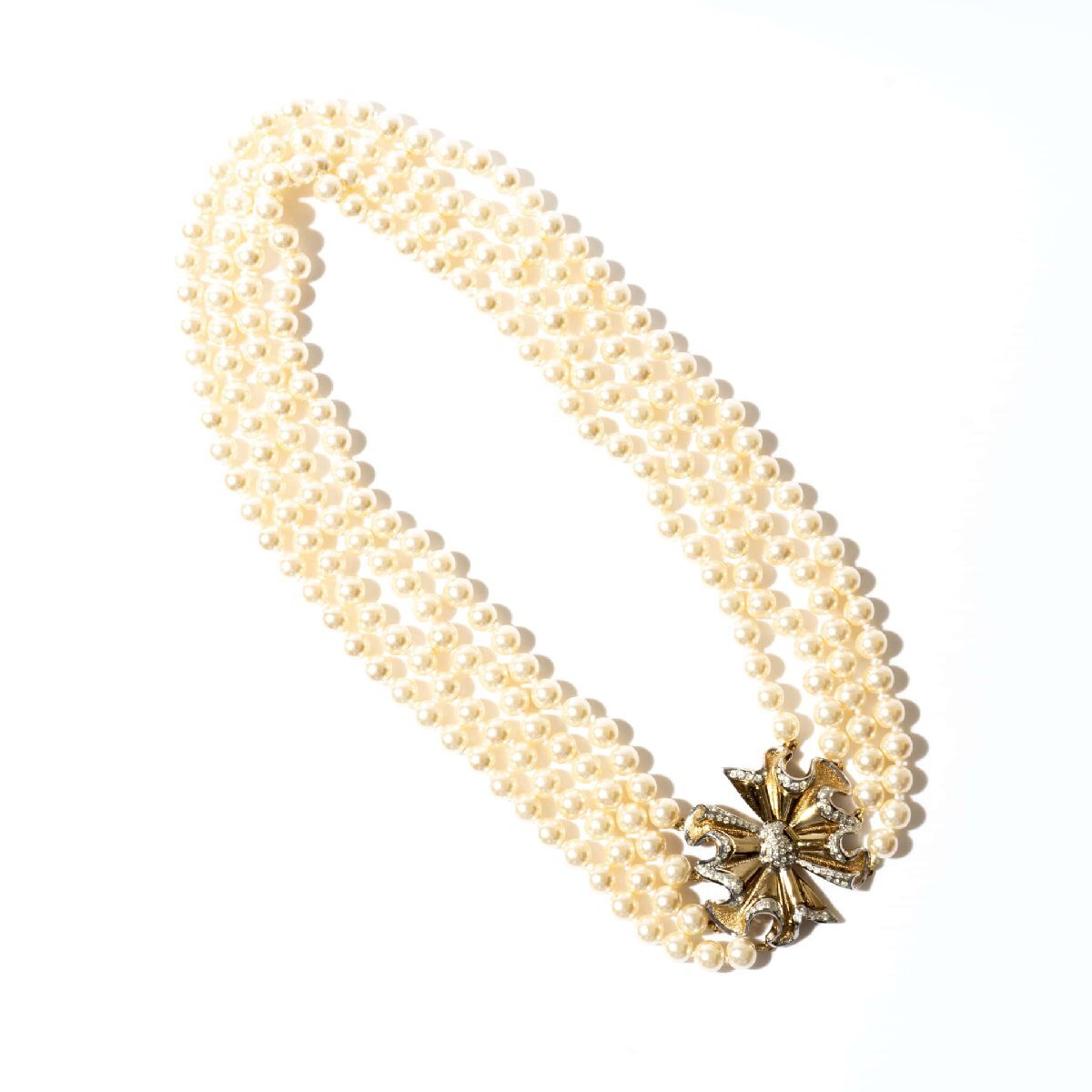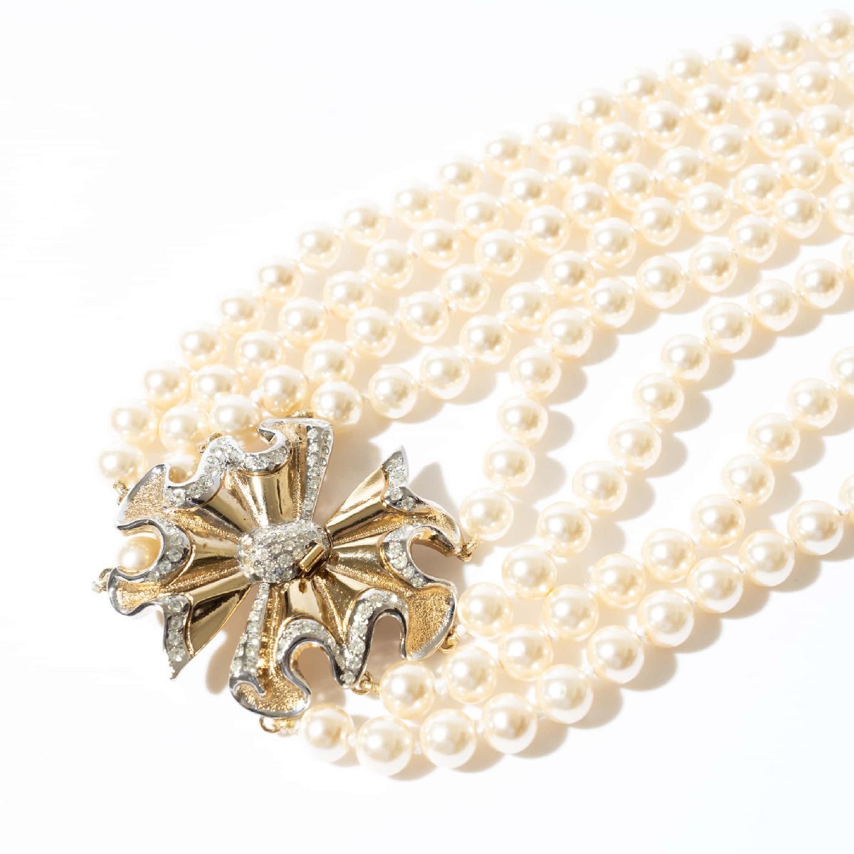 留め具部分のメタル装飾がリボンを表現しているゴージャスな4連のフェイクパールヴィンテージネックレス。
