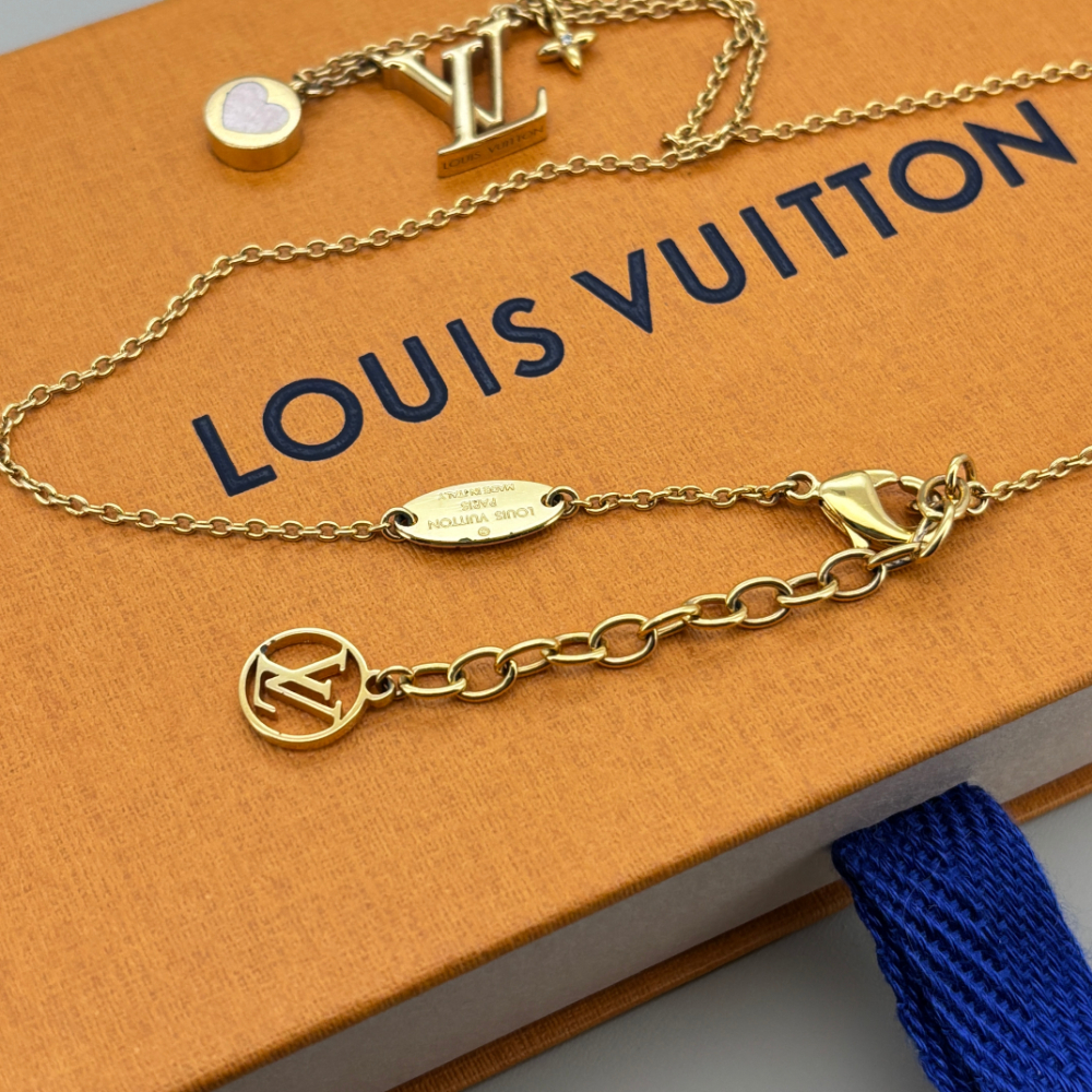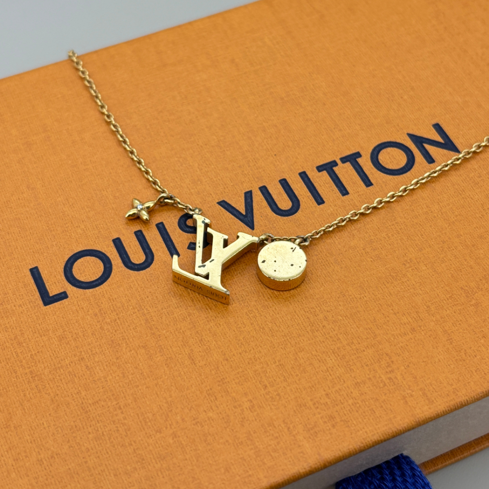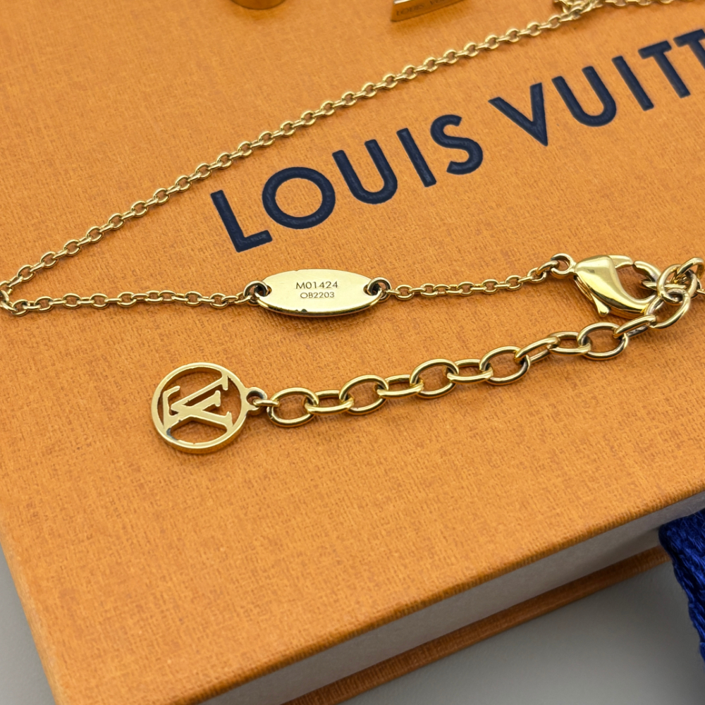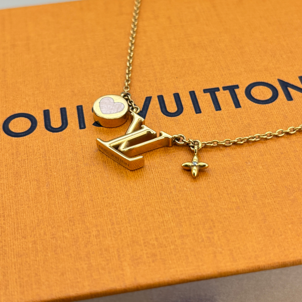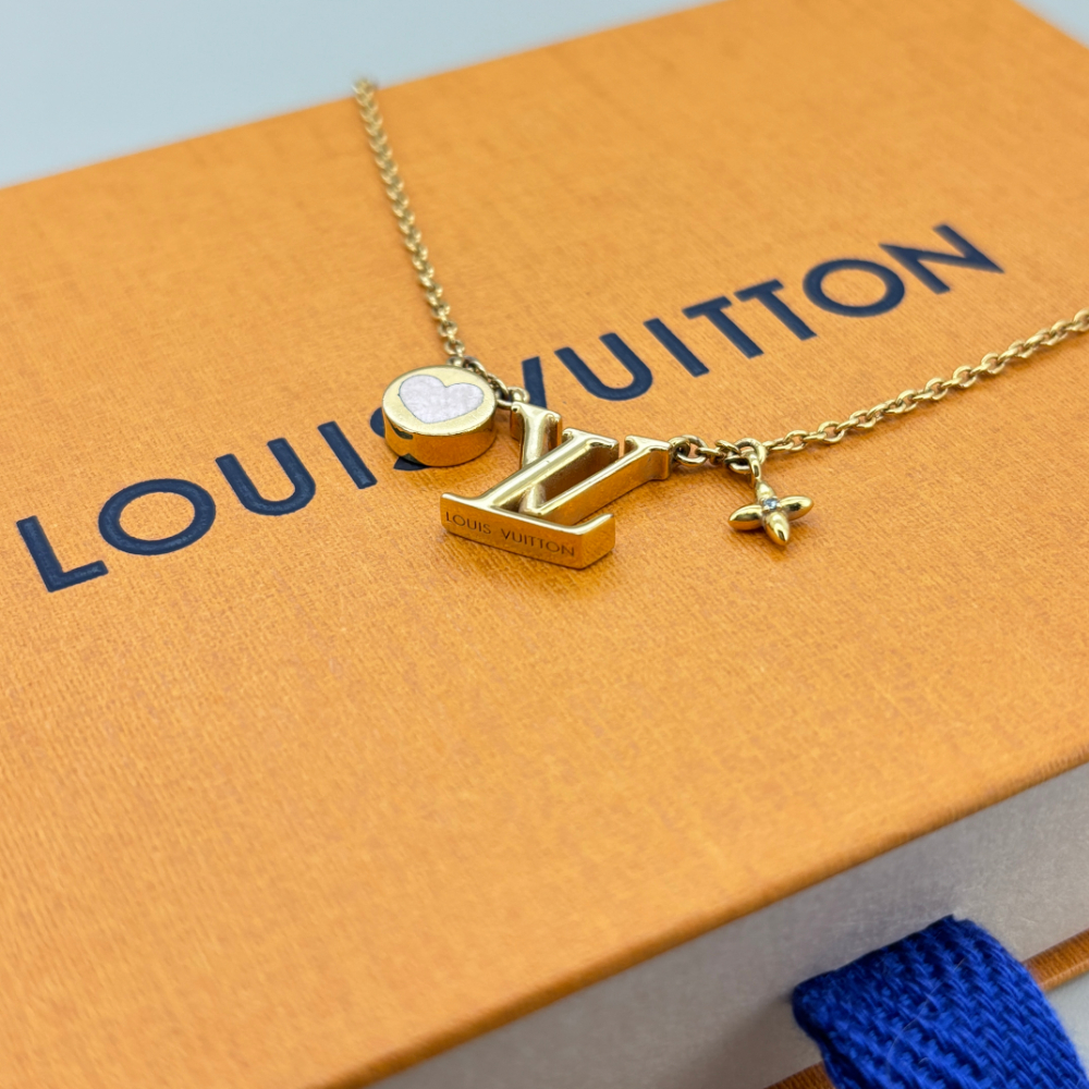 ゴールドカラーの極細チェーンに揺れ動くLV イニシャルのペンダントには、モノグラム・フラワー モチーフと魅惑的なエナメルのハートのチャームがあしらわれています。