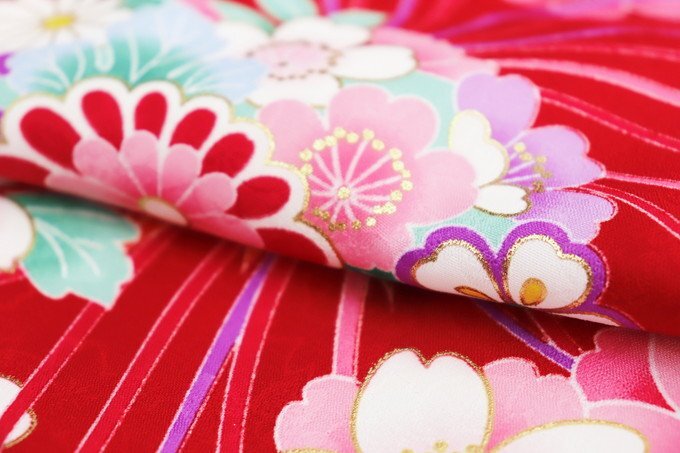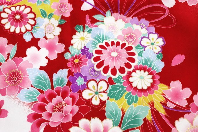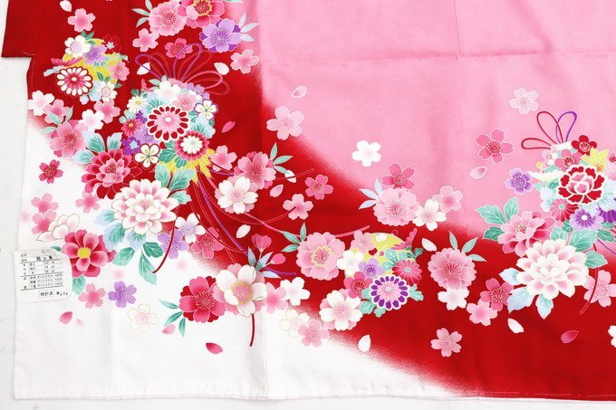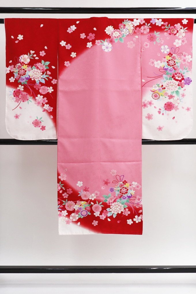 華やかな赤色系に染め上げた、可愛らしい七五三 女児(7歳用)着物です。