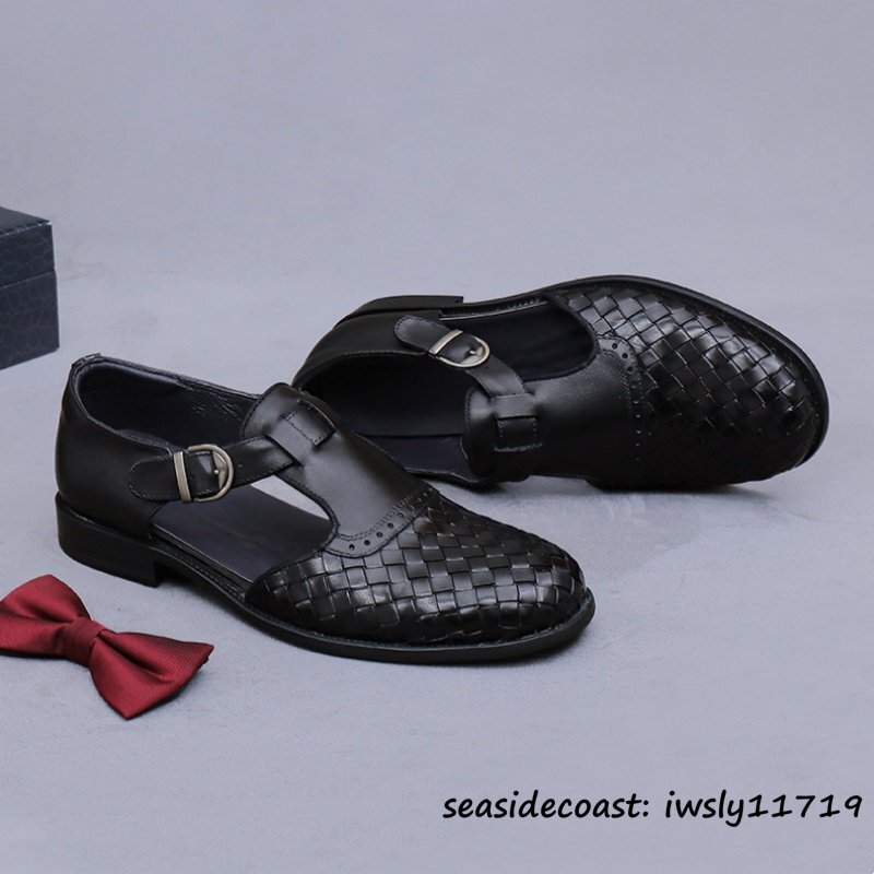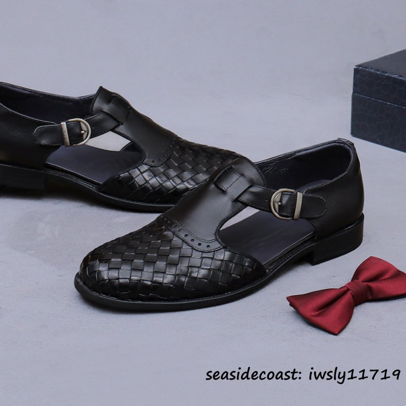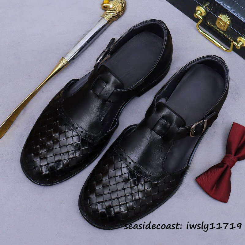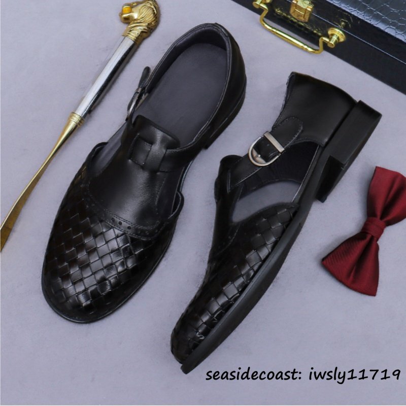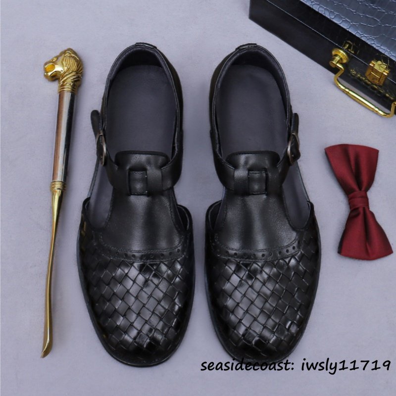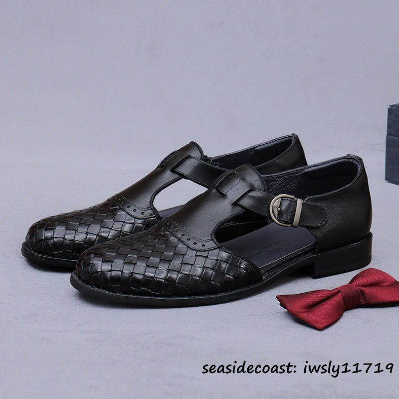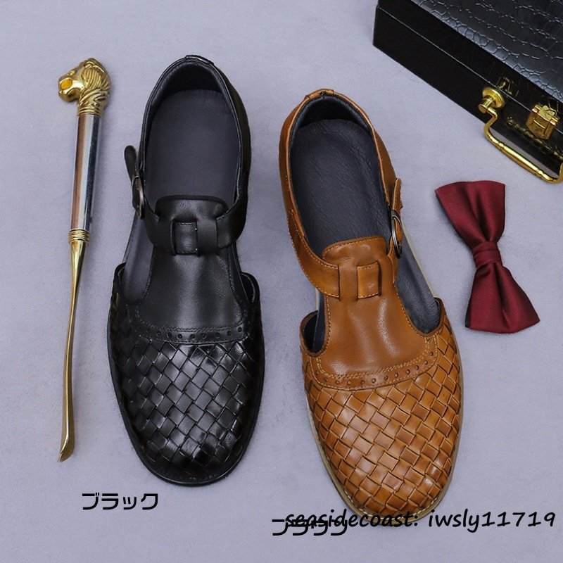 定価9万超★サンダル メンズ 本革 職人手作り 編み込み 彫り ビジネスシューズ 高級牛革 紳士靴 革靴 メッシュ イギリス風 ブラック 25.0cm