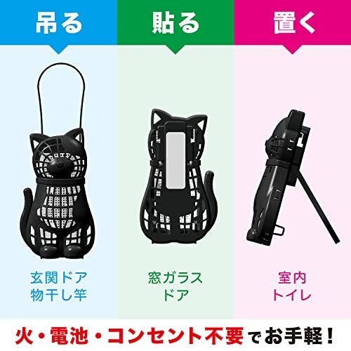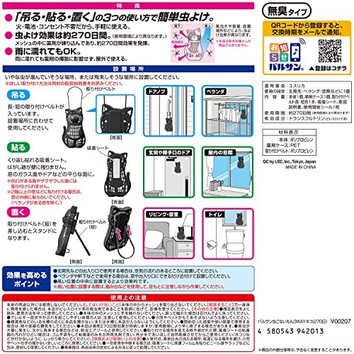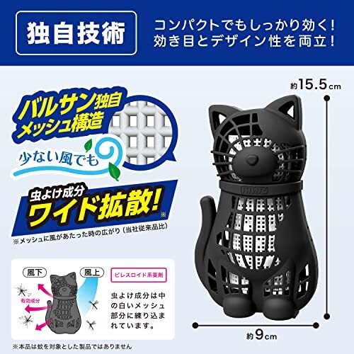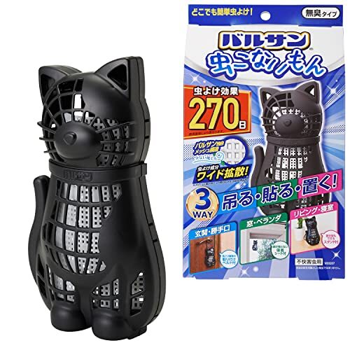 「バルサン 虫こないもん 3WAY 虫よけ 270日 (ネコ) 吊る・貼る・置くどこでも可能 バルサン独自のワイド拡散」▼4580543942013▼(商品説明)ネコ・ブラック 1個 (x 1) V00207・・PatternName:3WAYタイプStyle:ネコ・「吊る」「貼る」「置く」3つの使い方でどこでも使えます。・信頼と実績の「バルサン」。独自のメッシュ構造で少ない風でもワイド拡散!・玄関のドアノブに吊るしたり、窓に貼ったり、リビングや寝室に置いたり、いろいろなシーンで使えます。・虫よけは約270日!ワンシーズンご使用になれます。・雨に濡れても薬剤の拡散に影響しません。無臭タイプです。説明 商品紹介 ●虫こないもんの新シリーズが登場!吊る・貼る・置くの機能でどこでも虫よけ! ●少ない風でも虫よけ成分ワイド拡散の独自メッシュ構造でしっかり虫よけ。 ●いかにもな感じで目立つ虫よけプレートと違い、立体的でかわいいデザインなので、気軽にお使いいただけます。 ●吊るす場所に合わせて長さを選べる、長短2種類のベルト内臓。 ●繰り返し貼って剥がせる粘着シート付き ●インテリア空間に合わせて置き型もできるスタンド付き ●揮散性のあるピレスロイド系薬剤。 ●虫よけは約270日間(※ 使用環境によりの持続期間は異なります)。 ●パッケージ記載のQRコードから使用開始登録をすれば、交換時期を自動メールでお知らせ。 原材料・成分 ピレスロイド系薬剤