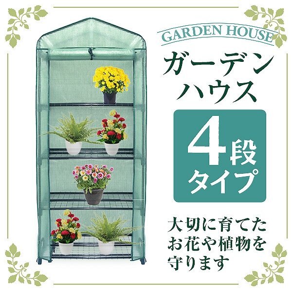 簡単に設置可能な4段用ガーデンハウスです。 雨や風、対策の難しい霜の被害などからお花や植物を守ります。 ビニールカバーを下ろせば害虫対策にも! 暑い夏はカバーを外して、シンプルなフラワーラックとしてもお使いいただけます。 お気に入りの植木鉢やシルクフラワーなどを立体的にディスプレイできます。 網目状の棚板で通気性は抜群!水やりなどの作業にもおすすめです。 コンパクトなのでお庭や玄関、ベランダに置いても邪魔にならず、 お天気が気になる時には室内にも置けるサイズ感です♪ カバーは巻き上げてロープで留められます。 お手入れ作業中や、ハウス内の温度上昇が気になる時はカバーを巻き上げ、 風をいれて温度調節が可能です。 組み立ては工具不要! 部品を差し込んで棚板を乗せるだけで簡単に完成します。 ぜひ、お気に入りのお花たちをいっぱいならべて あなた独自の素敵な空間を作り上げてみませんか♪ 【商品詳細】 カラー ・グリーン(カバー) ・ブラック(棚) サイズ:約)幅69cm×奥行き48cm×高さ150cm 重量:(約)4.75kg タイプ:4段 棚耐荷重:1段につき約5kg 素材:スチール、PVC 他 ※強風の際には外での使用をお控えください。 |
