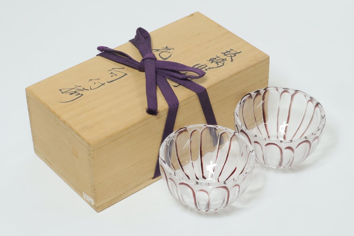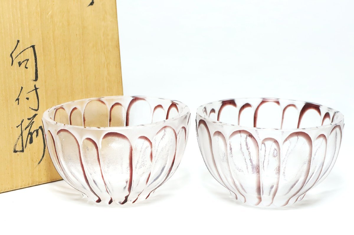 | ・荒木良忠 玻璃彫刻 花 向付 共箱 /硝子鉢 小鉢 赤 皿 |