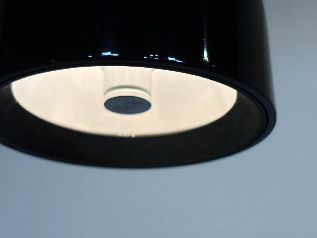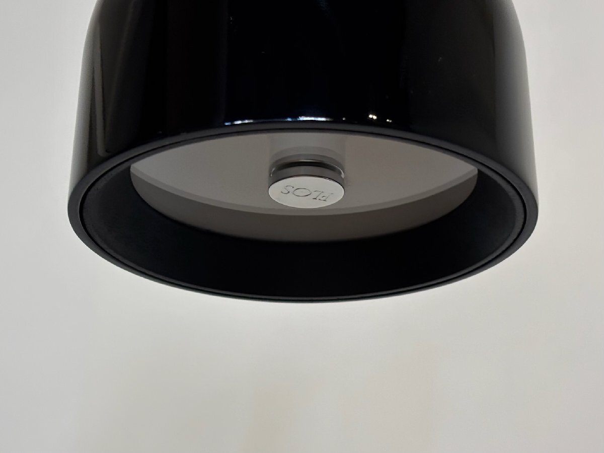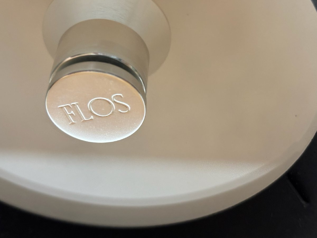 ポストモダニズムを感じさせるディフューザーに刻印された「FLOS」のブランドロゴが、侘び寂びや禅などのデザイン哲学を主とする日本製から解き放つ基点として主張を放つ、重要なデザイン要素。