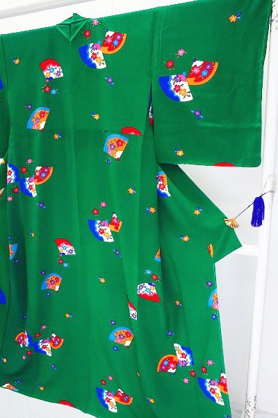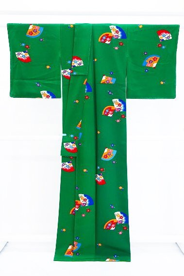 | 未使用品 小紋 縮緬地 緑 扇面 桜花 トールサイズ 身丈165cm 裄丈69cm 袷 正絹 お洒落 仕立て上がり カジュアル 着物フィ m-8247 |