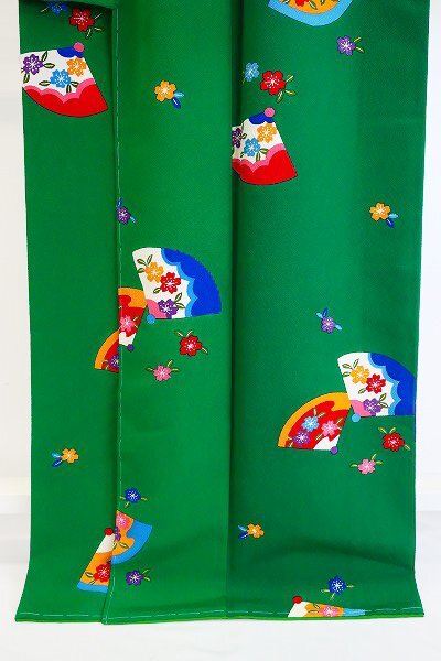 緑の縮緬地に、扇面に桜花が描かれた小紋です。 鮮やかなお色味が目を惹く一枚です。 トールサイズですので背の高い方にもおすすめです。 パールトーン加工済です。 未使用品です。 担当:伊藤 |