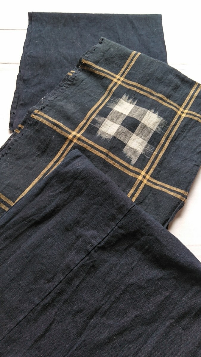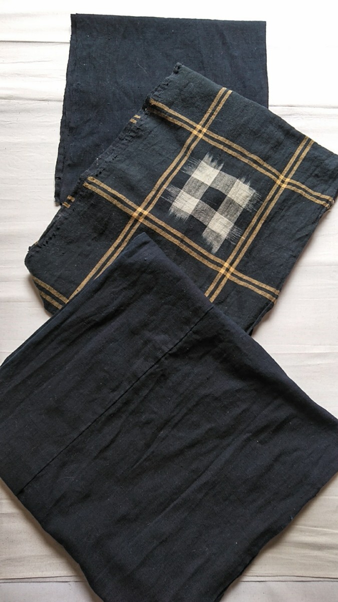 布地 古布 レトロ 木綿 生地 濃い藍色無地 2枚 藍色井型柄 1枚 リメイク