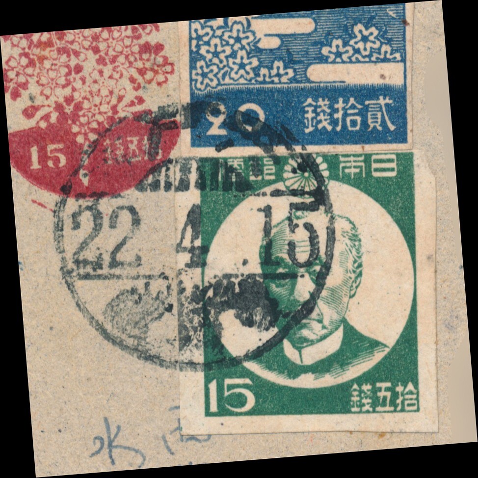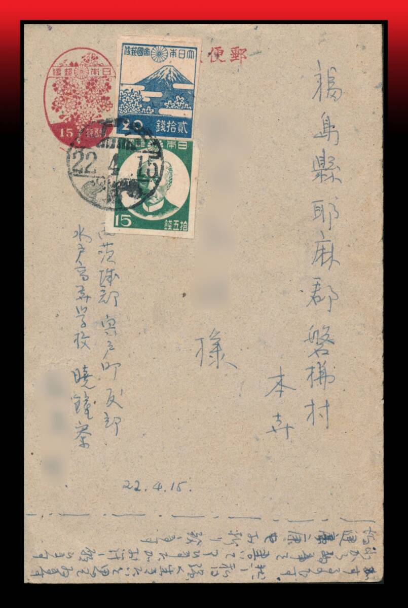 ●桜15銭葉書+富士と桜20銭他計35銭 櫛型印:(宍戸)/22.4.15/(茨城縣)※局名は住所〜 エンタイア
