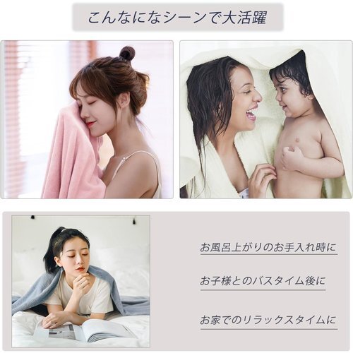 【なめらかな肌触り】極細繊維のマイクロファイバー素材で、なめらかな肌触りとカットパイル仕上げにより、髪や肌へのダメージを軽減します。全身を優しく包み、お風呂上りの水分をとにかく素早く吸い取るバスタオルです。