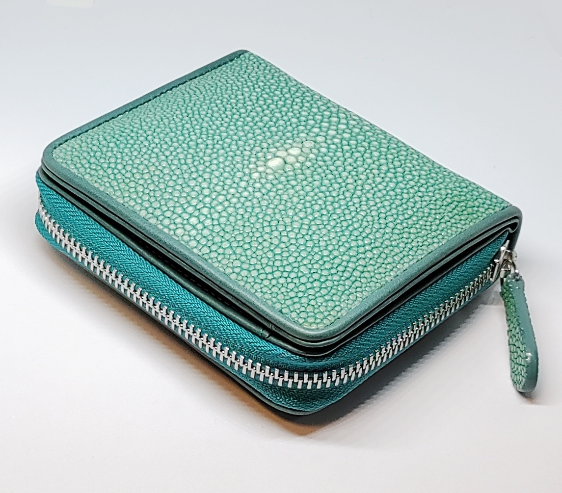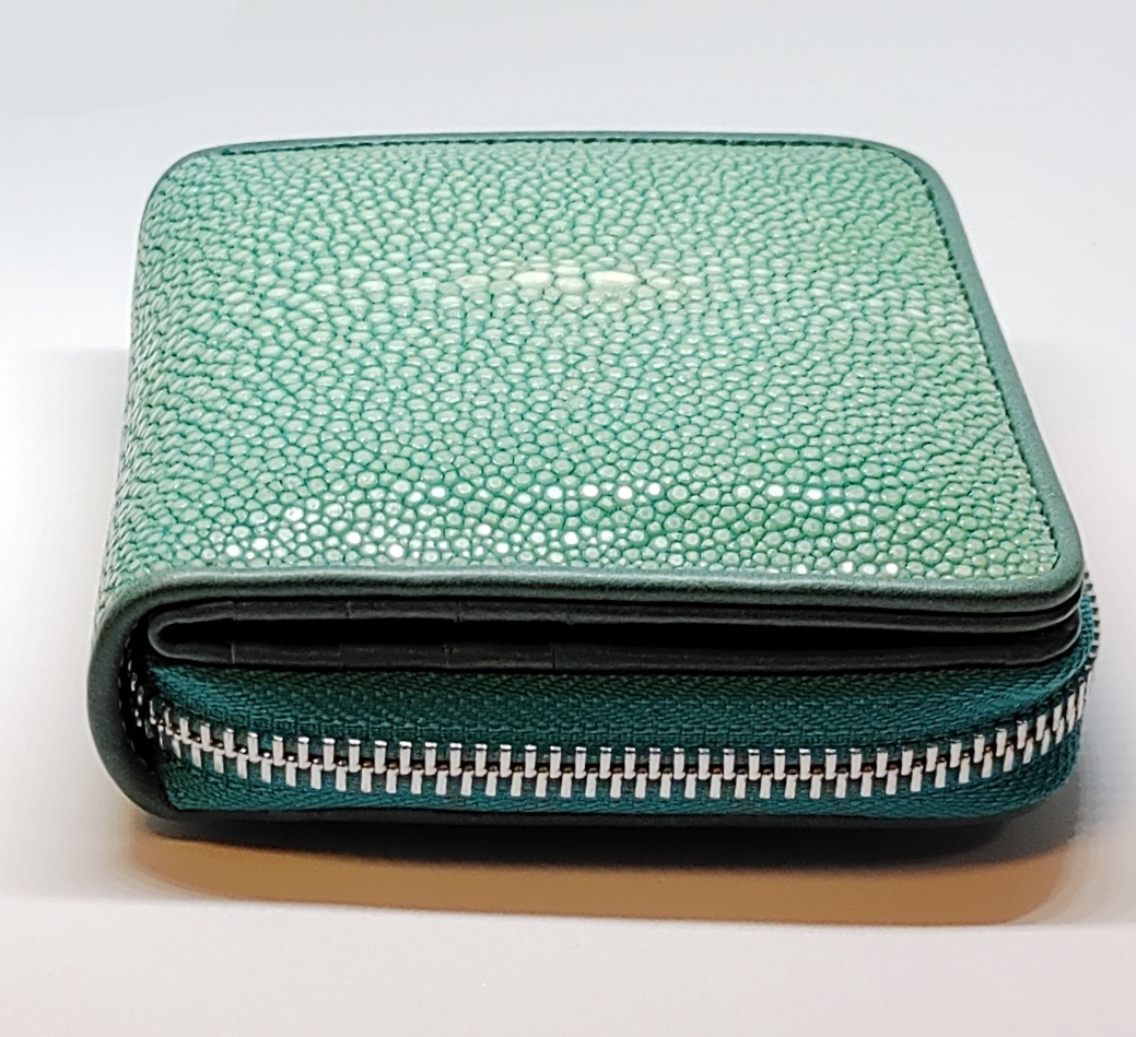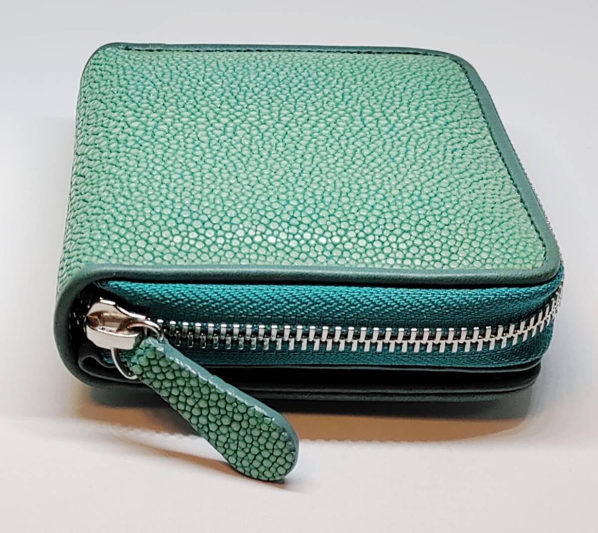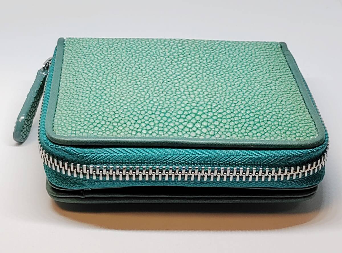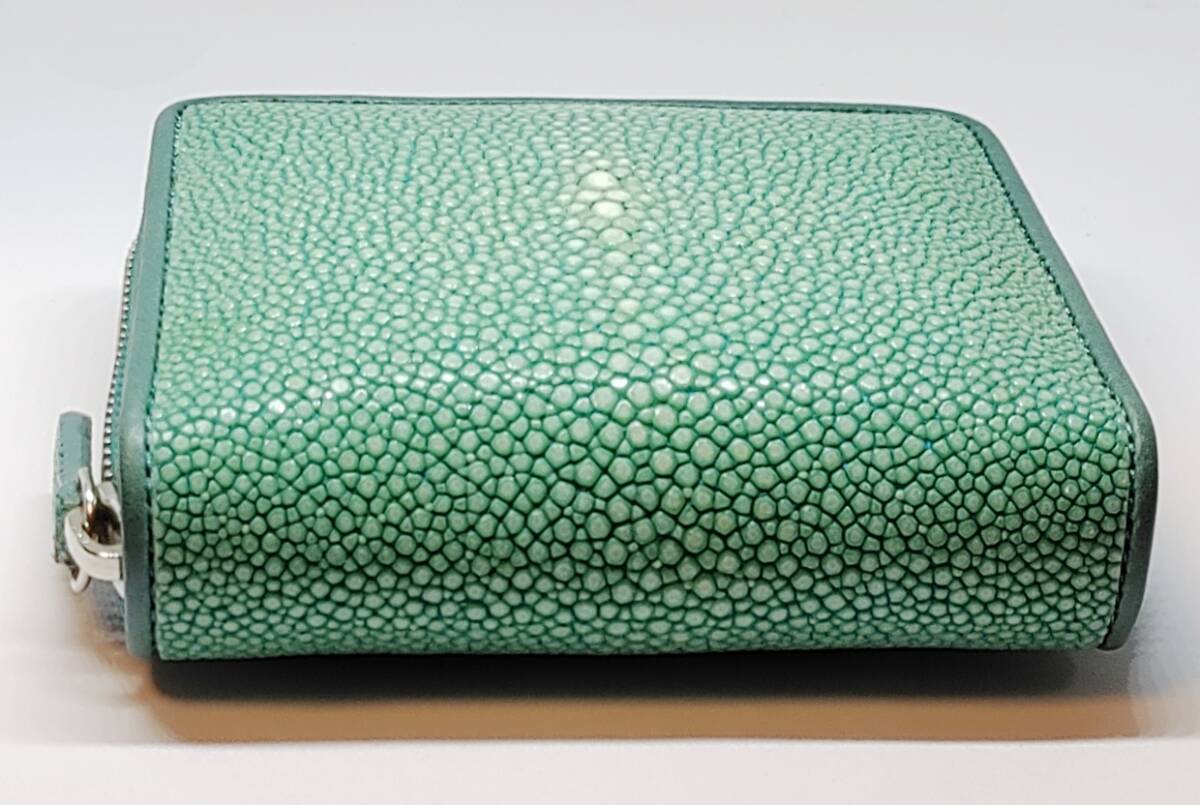 ★スティングレイ★ 2つ折り財布 ウォレット エイ革 海の宝石 ラウンドファスナー 高級レザー ターコイズグリーン 独立コインケース