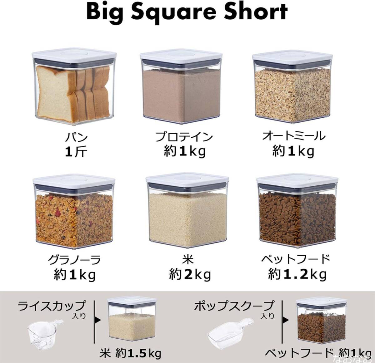 ビックスクエア ショート は、食パン 1斤、 米 約2kgほどが入ります。※実測値ですが、食材のメーカーや形状によって、適正容量は差異がでる場合がございます
