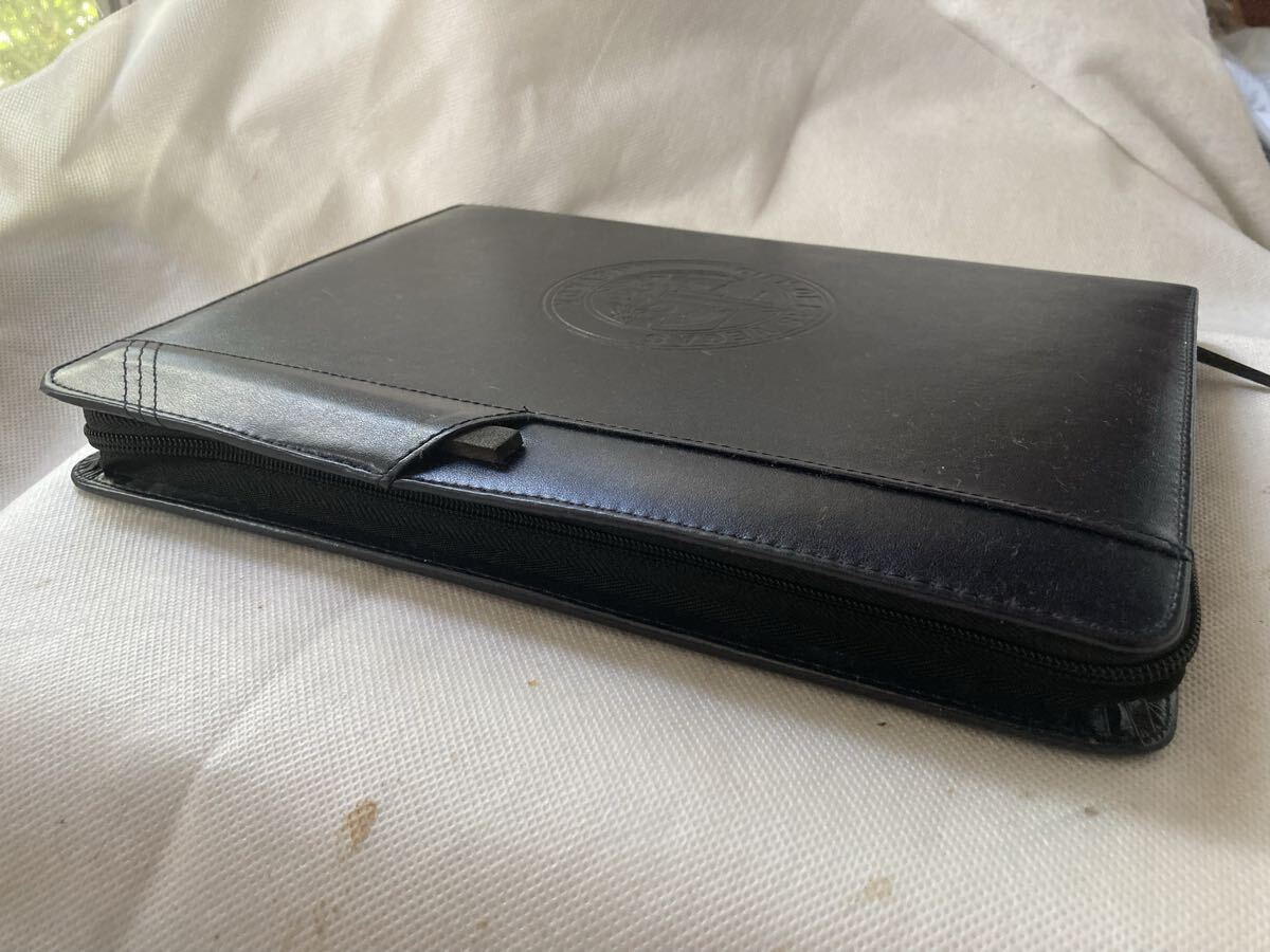 ◆ ブラックの革製で、サイズは、25cmX32.5cm、厚さ2.5cmほどのA4サイズ対応で、ファスナー開閉です。