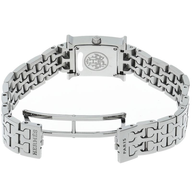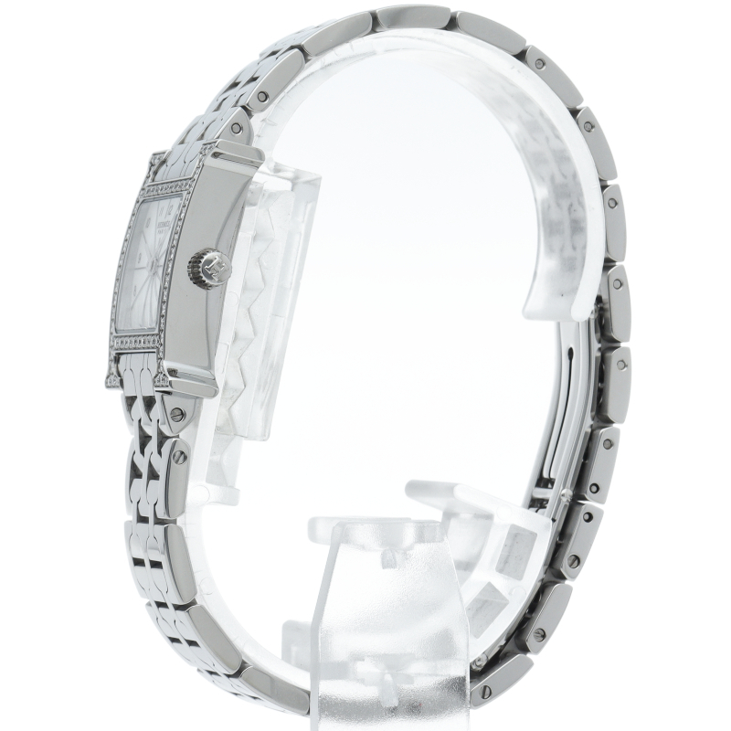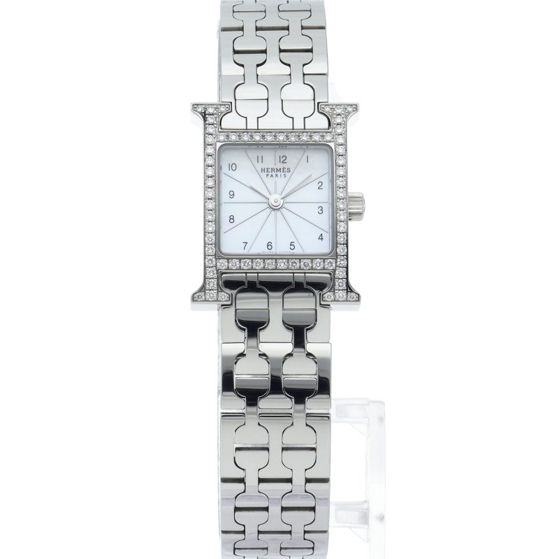 商品説明:エルメスの頭文字である“H”をモチーフにしてデザインされた“Hウォッチ”。 ケースは腕にフィットするよう緩やかなカーブを描いており、着け心地は抜群です。ベゼルにダイヤモンドを贅沢に敷き詰め、エレガントで味わいのあるデザインに仕上がっています。