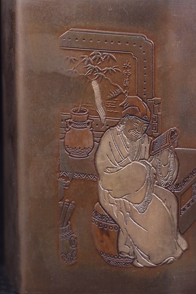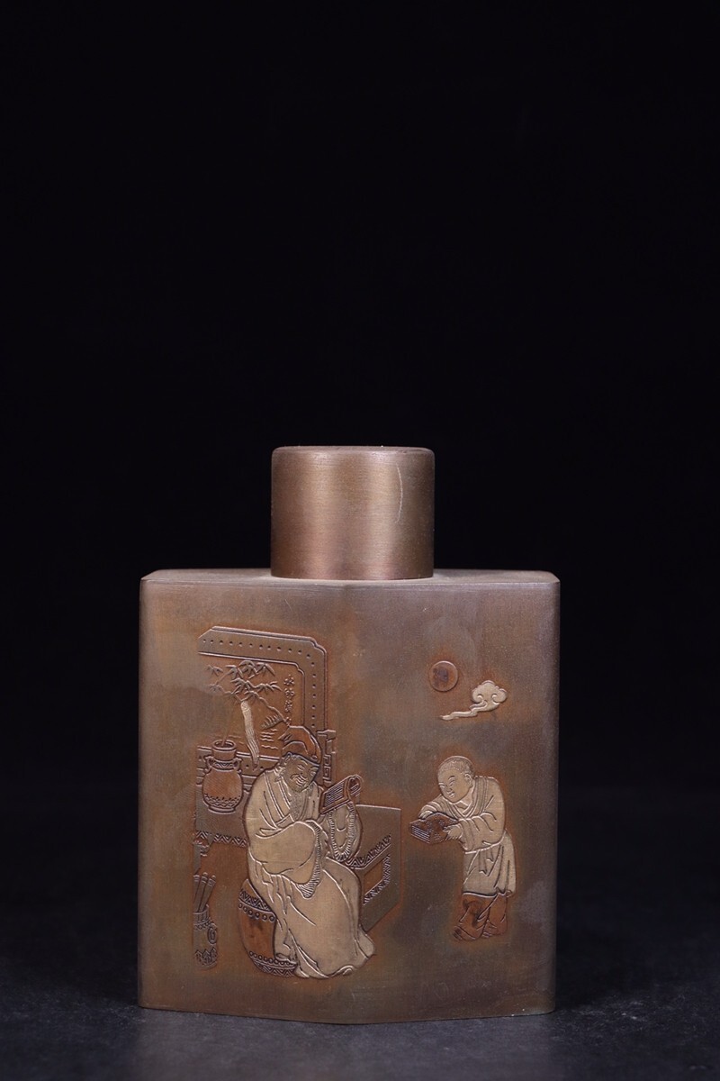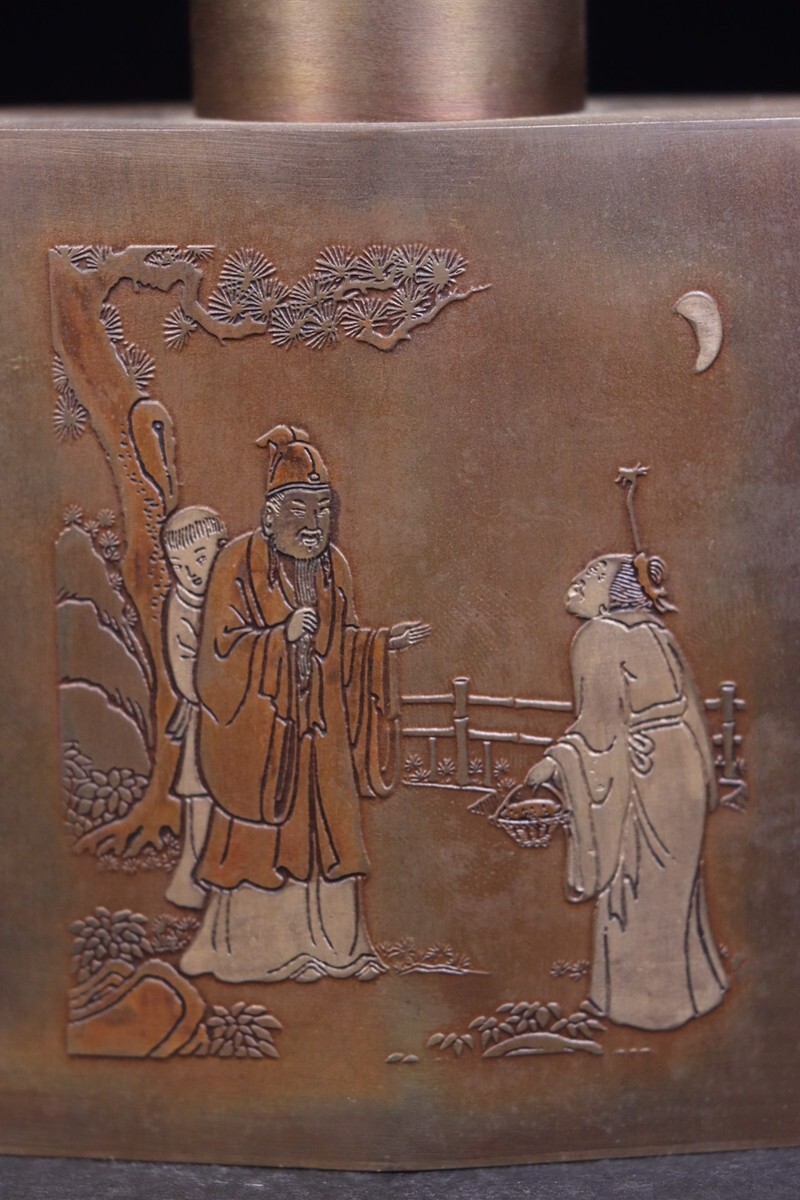 「清代 文齋 古銅彫 人物故事 茶葉罐」旧銅器 置物擺件 賞物 中国古美術 旧蔵出