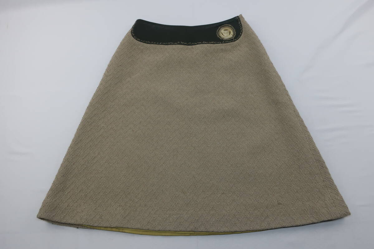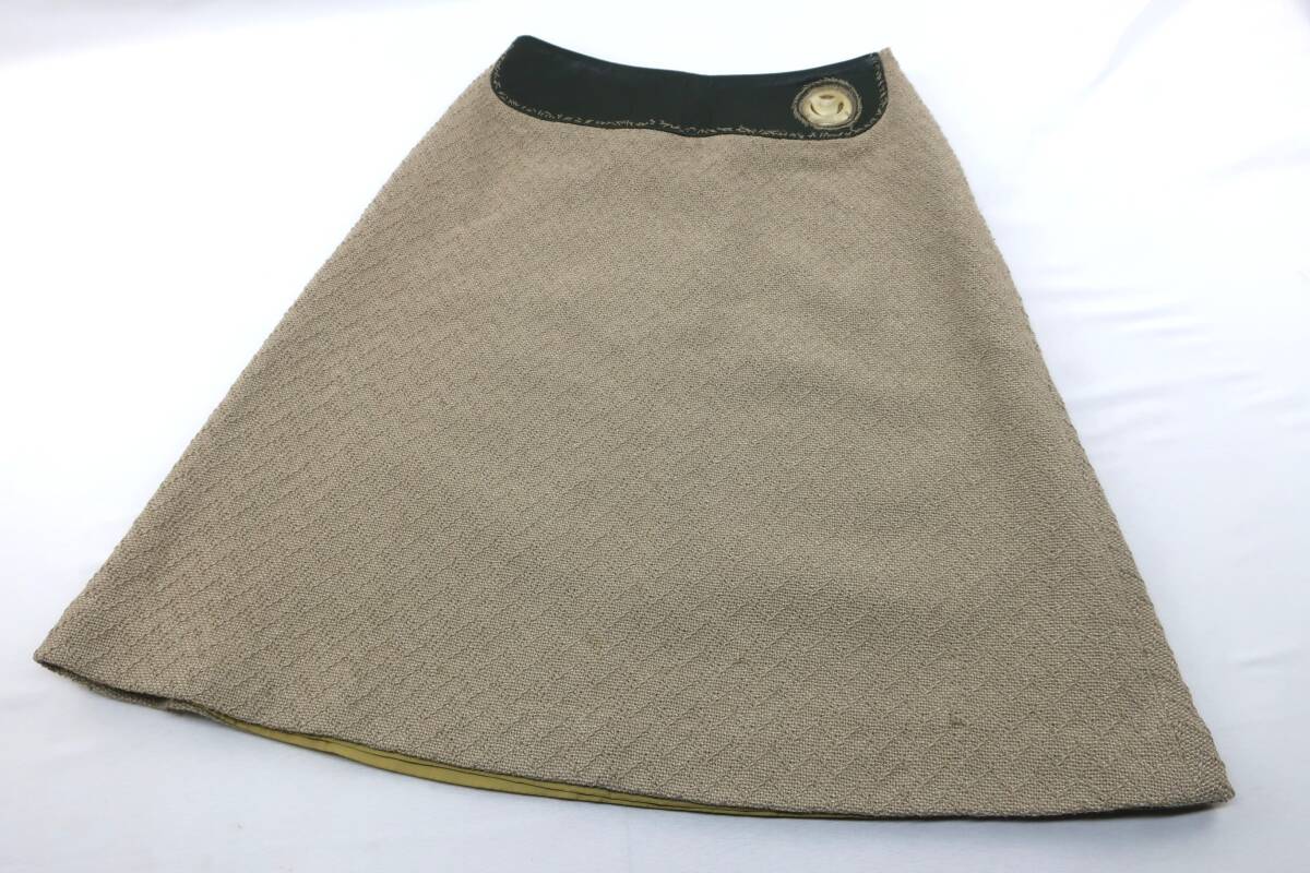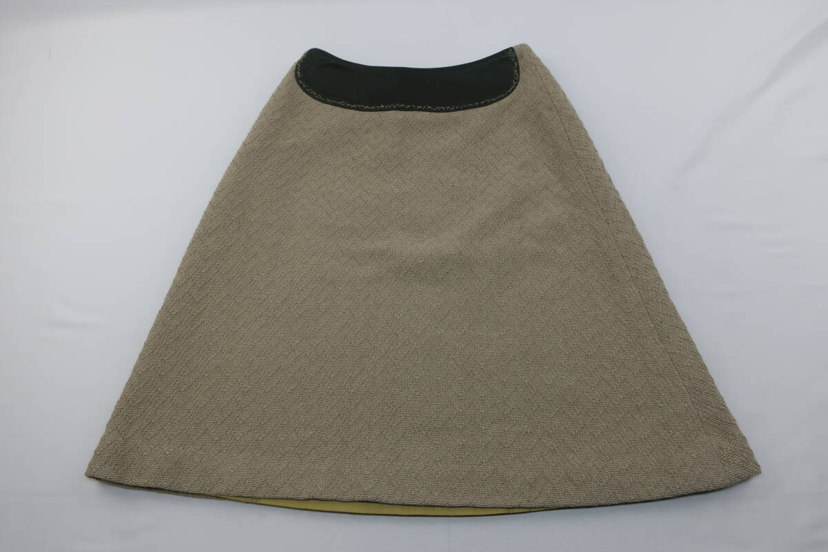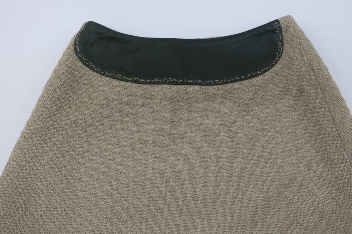 【送900円】1113 mina ミナ cloudy 台形スカート 膝丈 毛×ナイロン レザー 牛革 カーキ×ベージュ Aライン サイドジップ