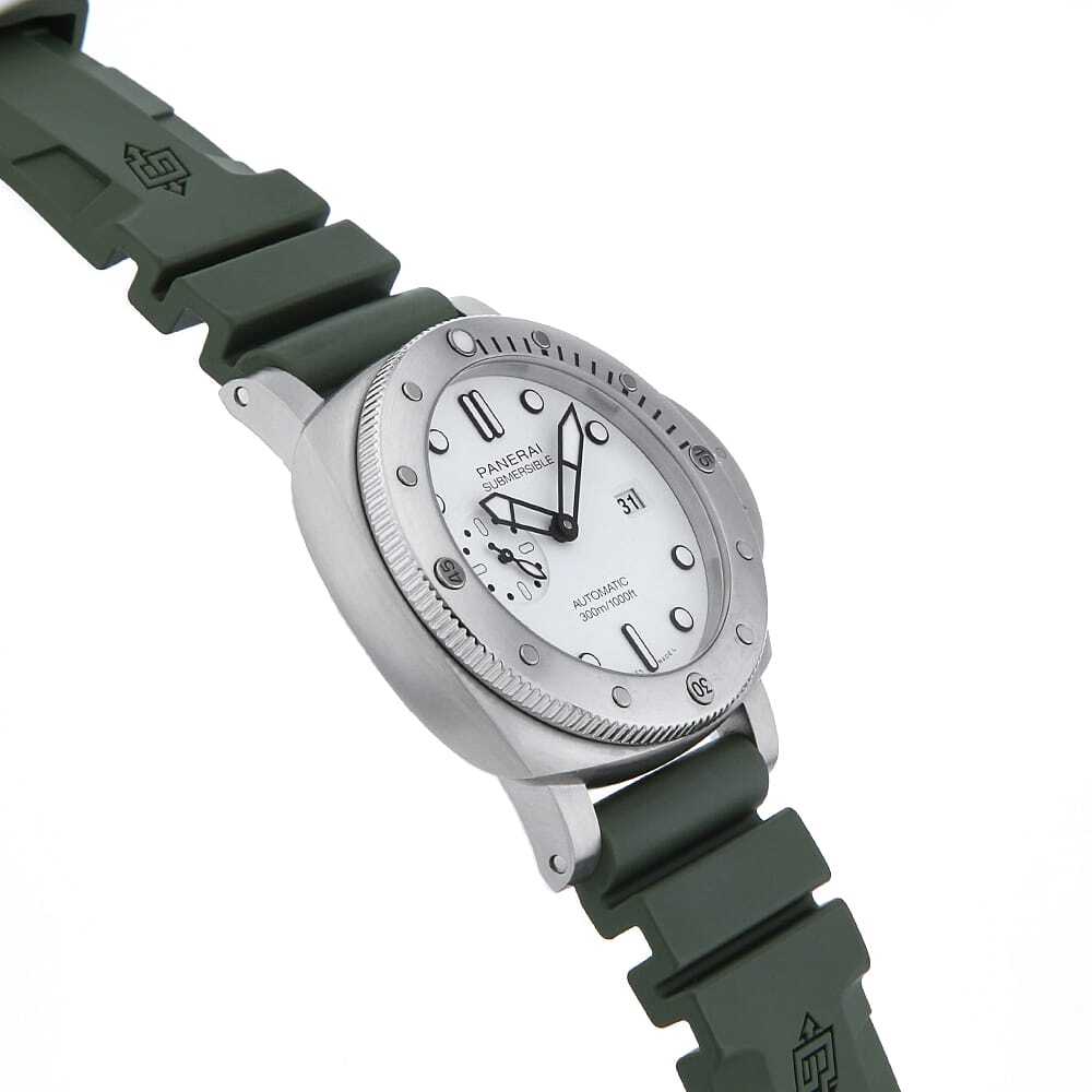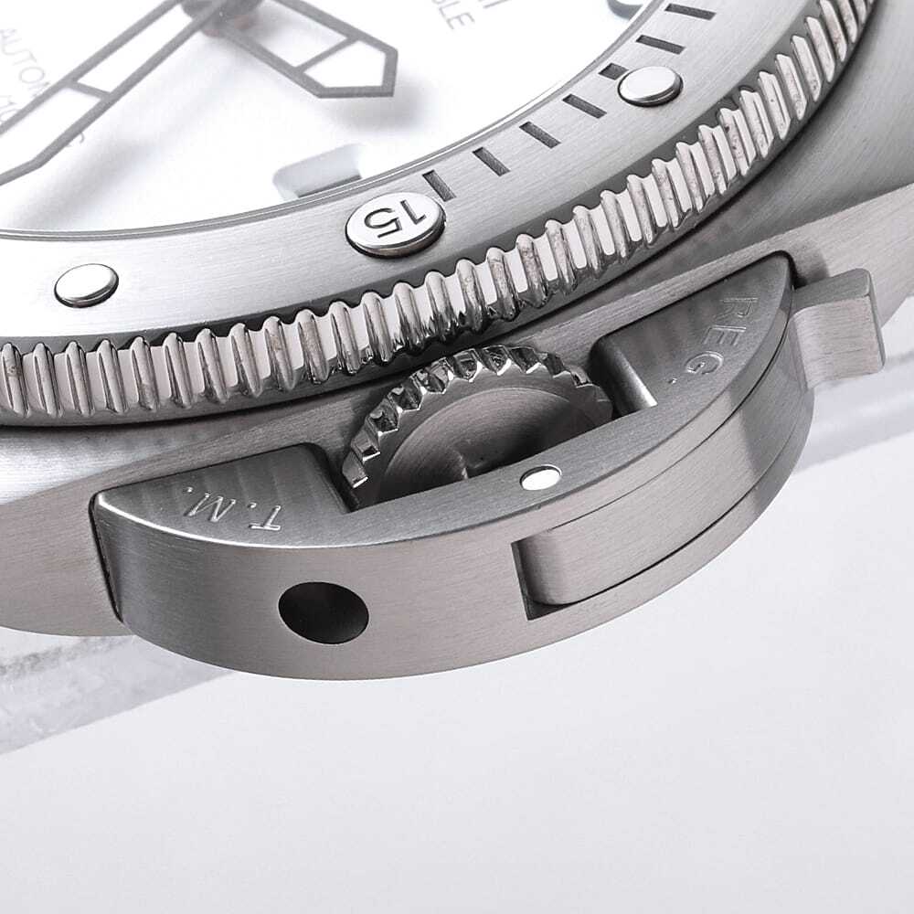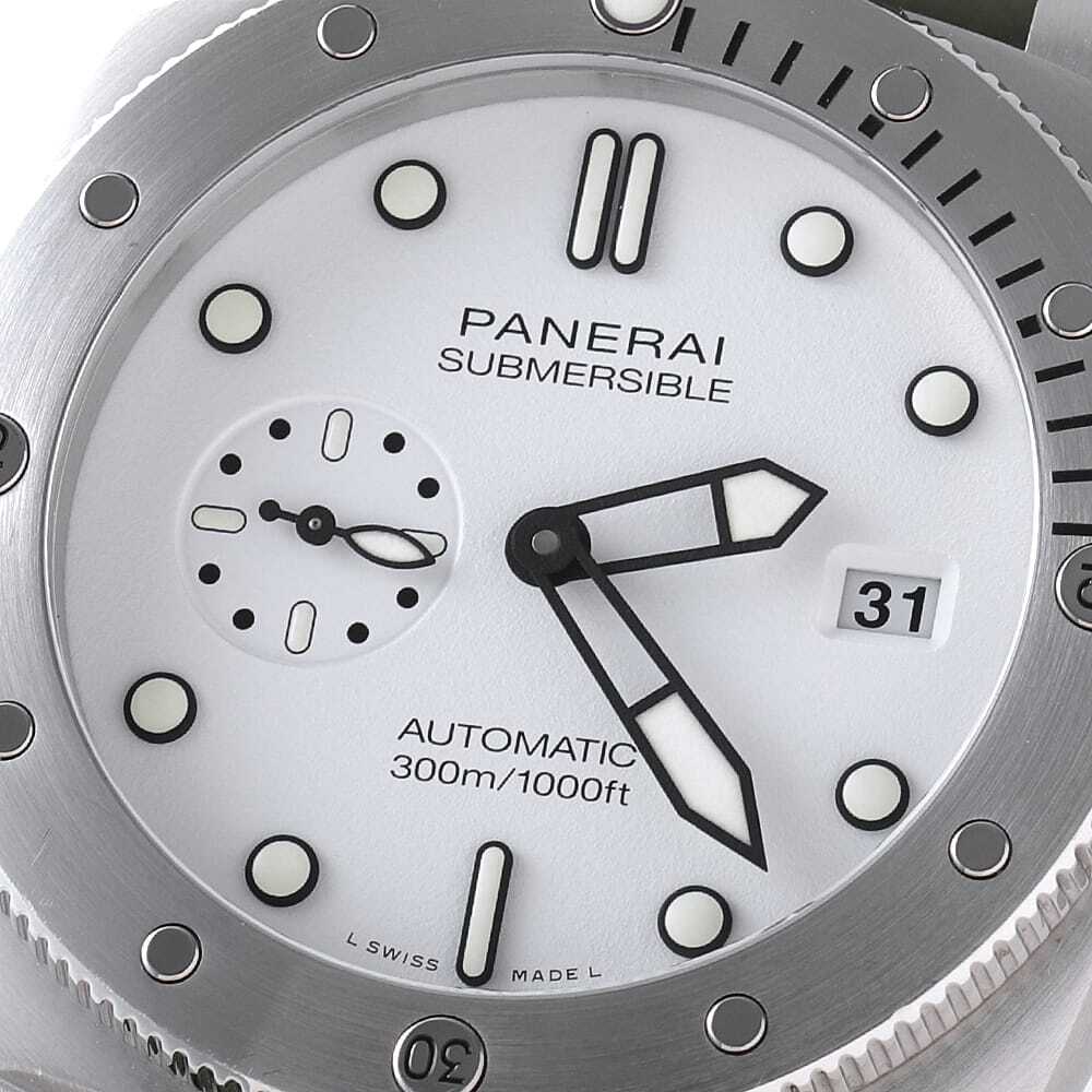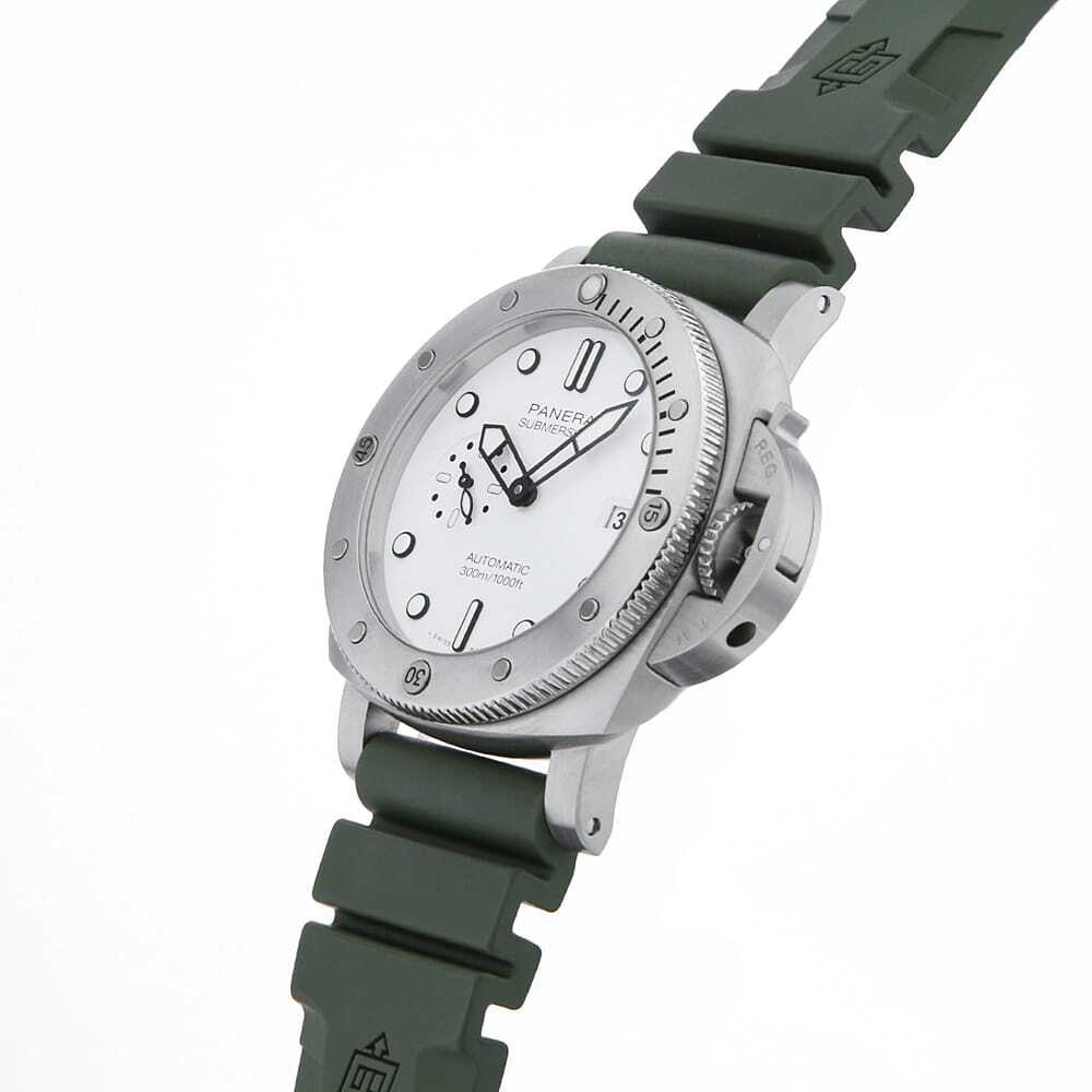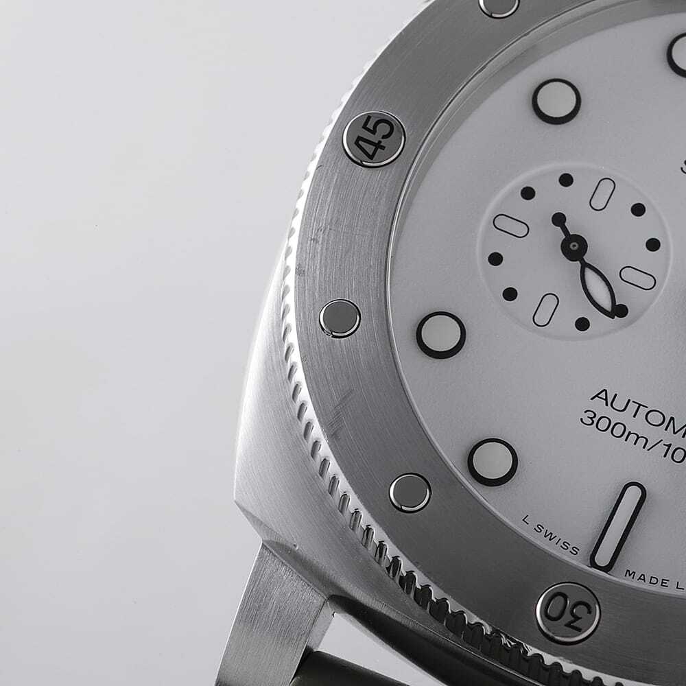 モデル情報 | 2022年発表のケース径44mmのサブマーシブル クアランタクアトロ ビアンコです。リューズプロテクターはそのままに、ダイビンググローブを着けたままでも操作性の良い逆回転防止ダイビングベゼルを搭載しています。300M防水。72時間のパワーリザーブ。 |