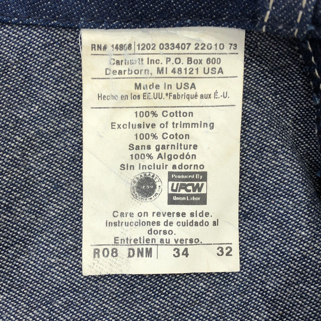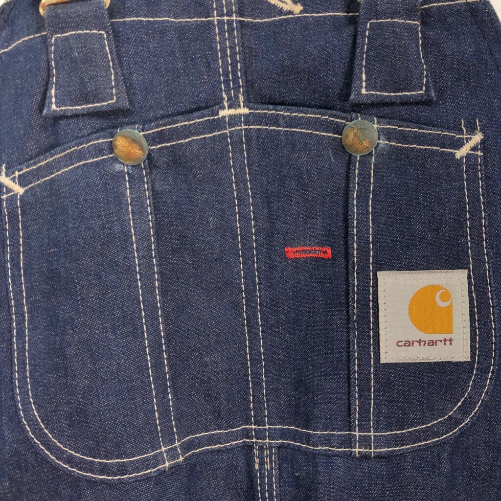 【商品管理番号】 T4884 【ブランド】 Carhartt/カーハート 【サイズ】 W34 L32 【実寸サイズ】 総丈:約152cm ウエスト:約90cm 股下:約84cm わたり幅:約36cm 裾幅:約27cm 【主な素材】 表地 : コットン 【色】 ブルー 【仕様】 生産国 : USA製 90年代 ビブオーバーオール 【状態】 汚れ:裾、もも、ひざ、スネ、ふくらはぎ 特記事項:金具錆び |