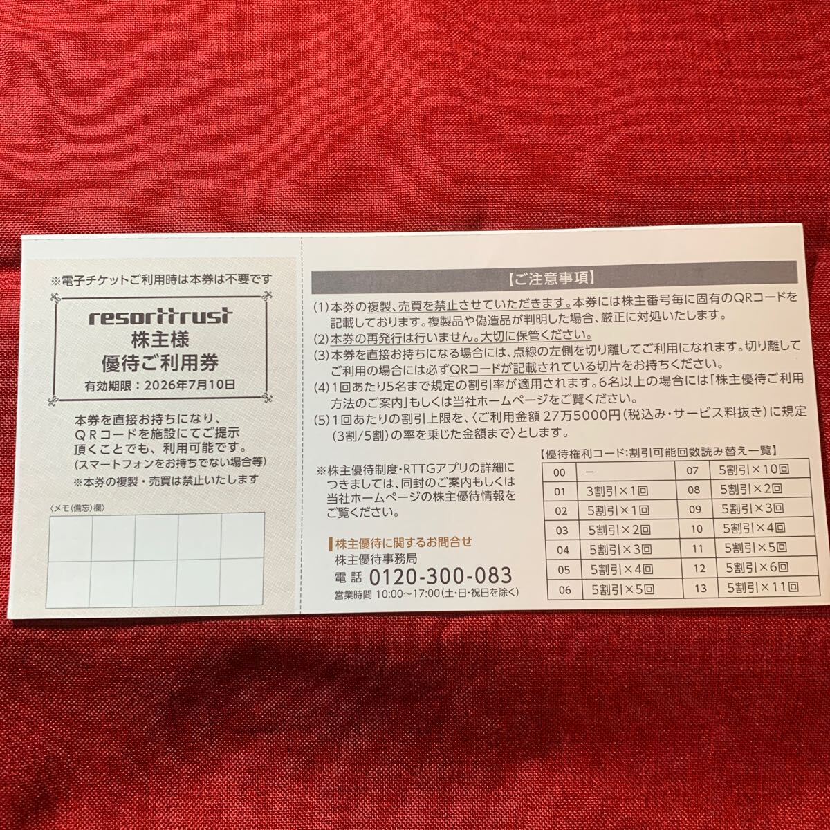 ゆうパケット送料無料 リゾートトラスト株主優待3割引券1枚 20260710 男性名義