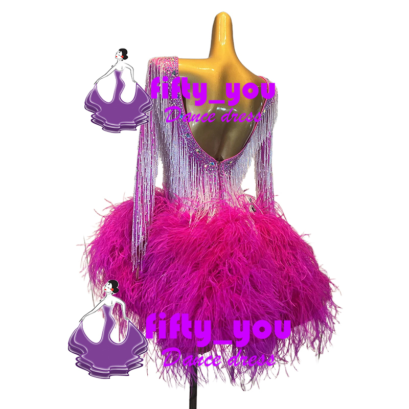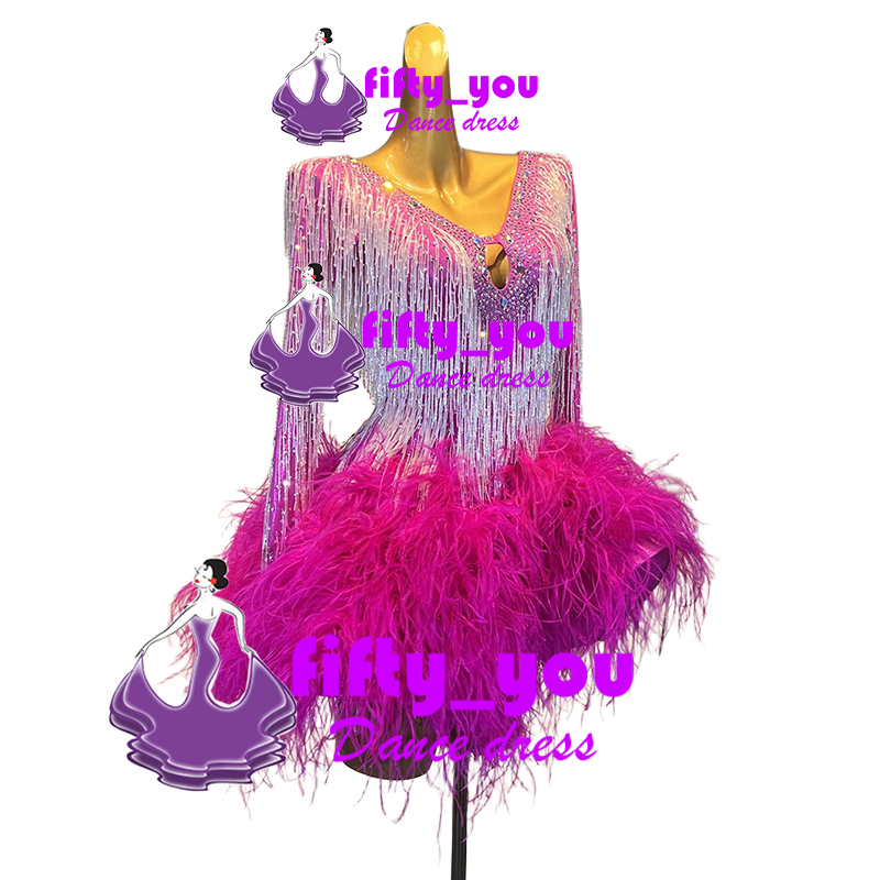 新品fifty_you レディース社交ダンスドレス  ラテン競技用ドレス 魅力セミオーダー ゴージャスビーズ飾り 裾ファー付き 濃いピンク色