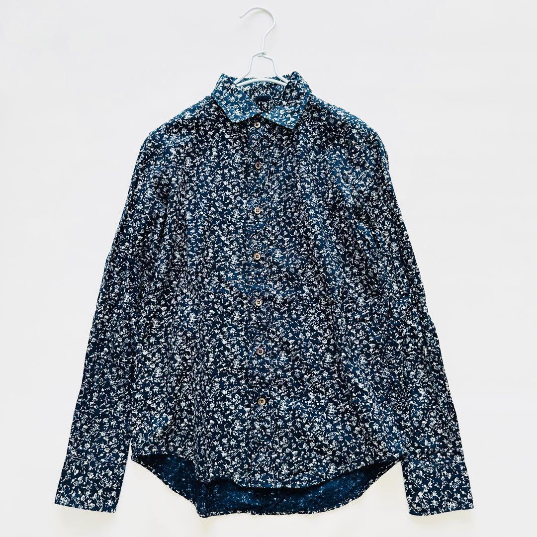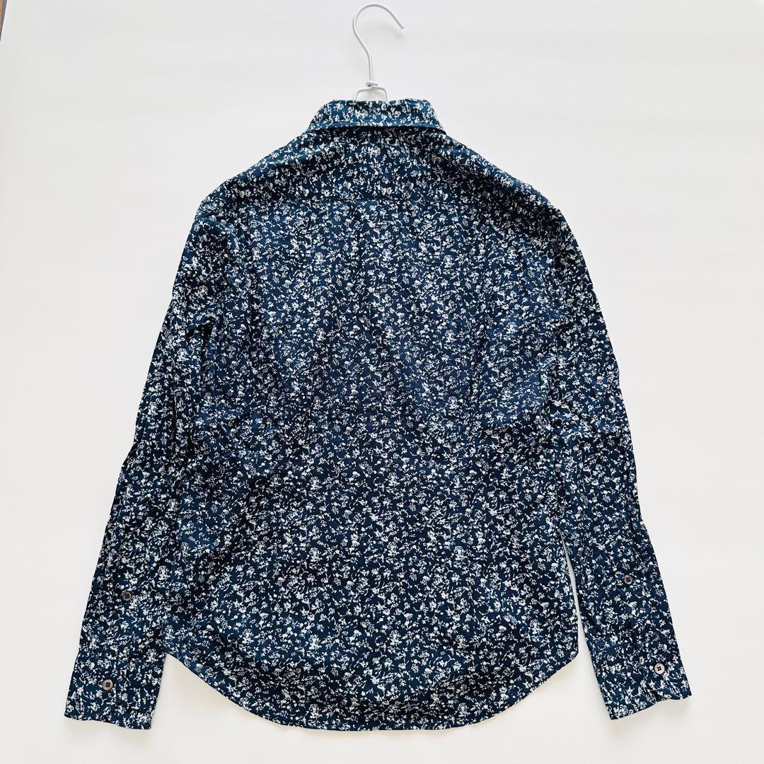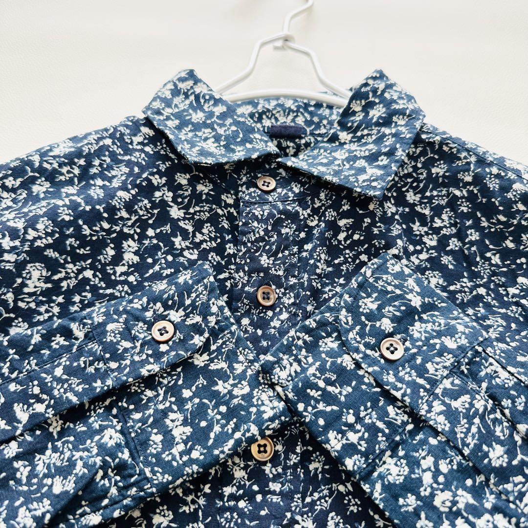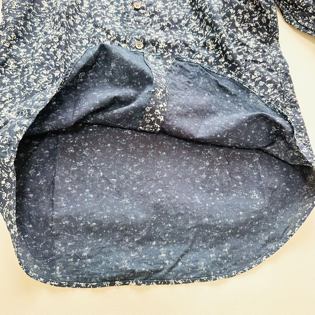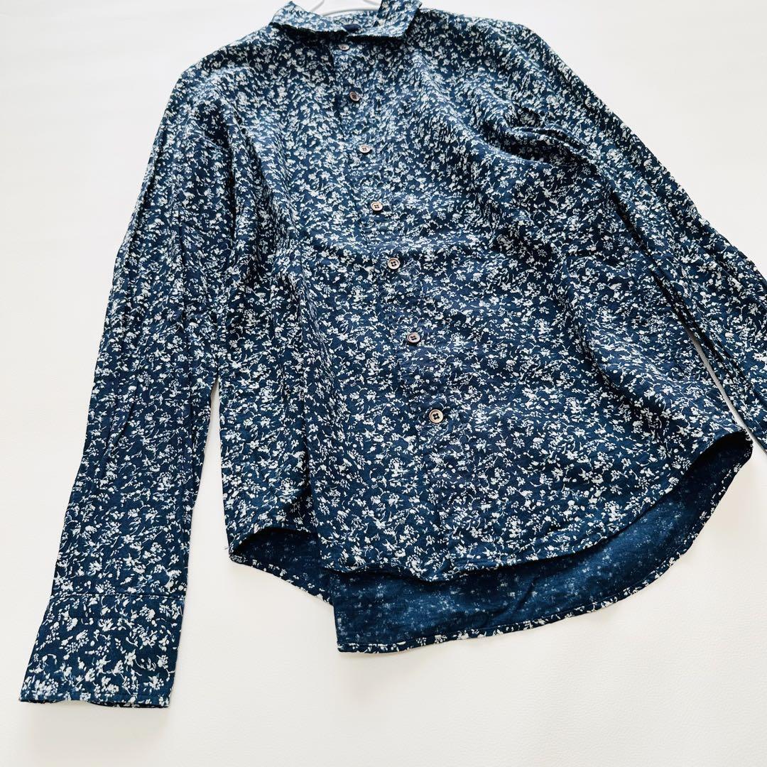 美品 45R フラワープリントシャツ 長袖 コットン カジュアルシャツ 紺×白 花柄 2