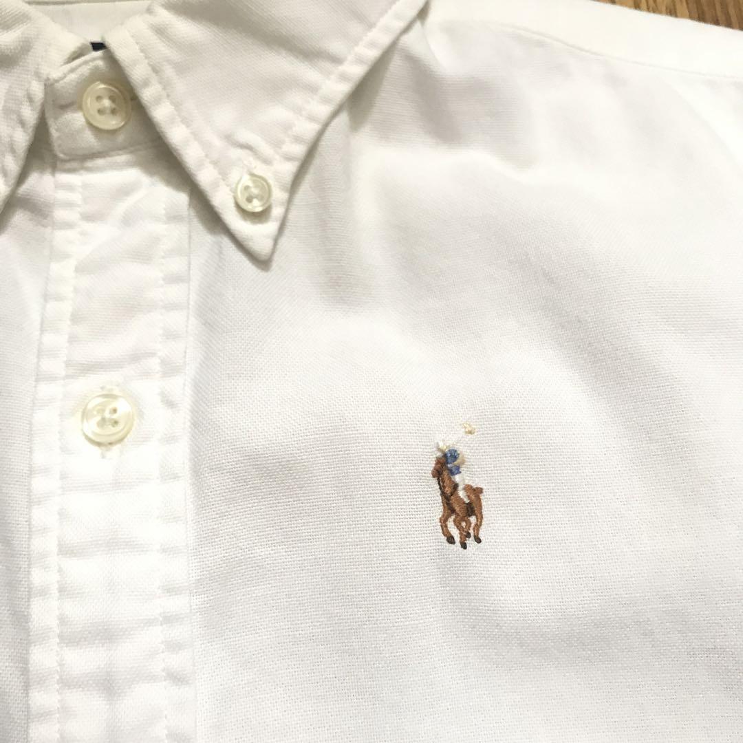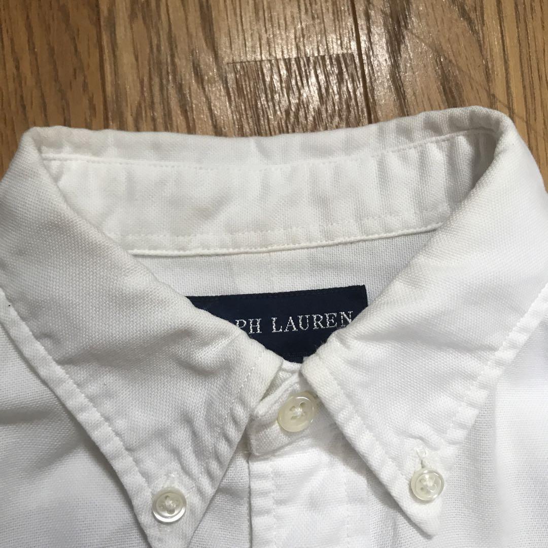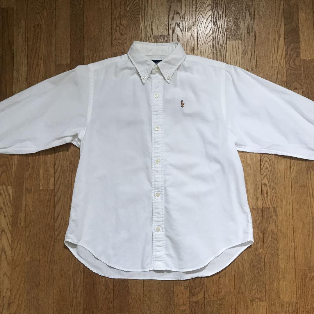 Ralph Laurenのホワイト長袖シャツ、ボタンダウンカラーのデザイン。