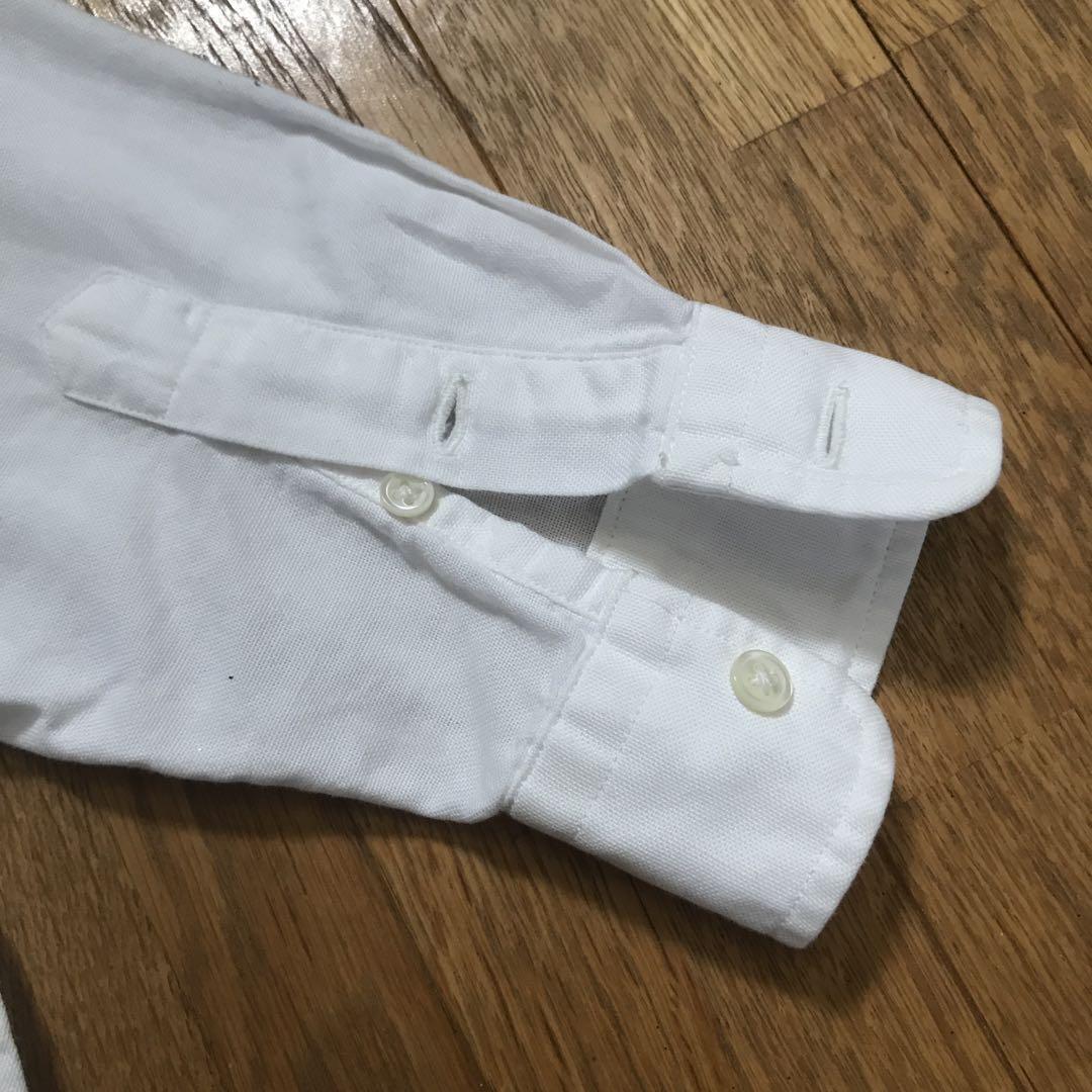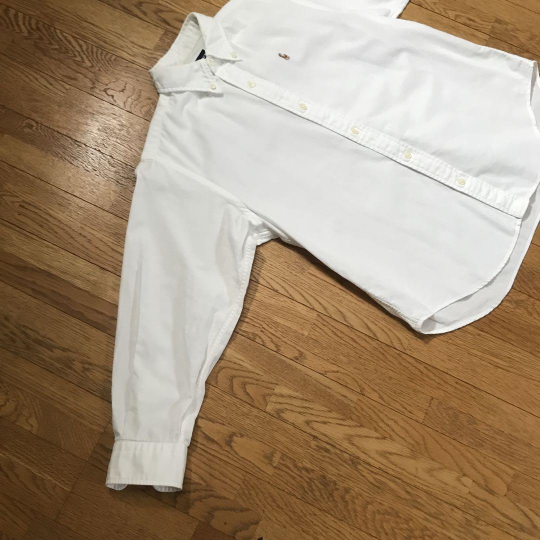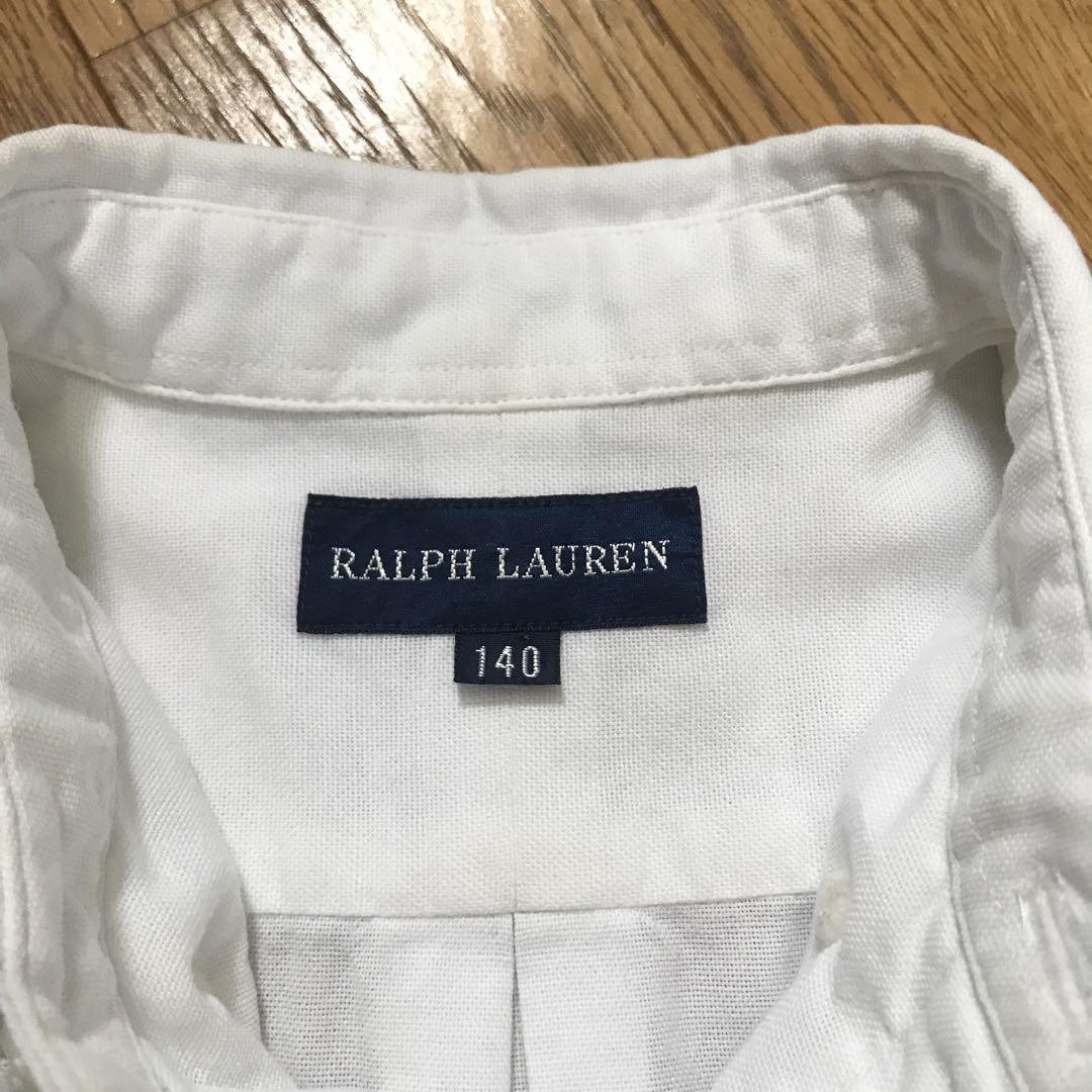 Ralph Laurenのホワイト長袖シャツ、ボタンダウンカラーのデザイン。