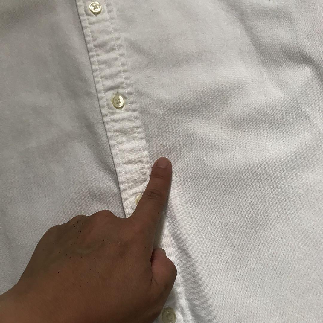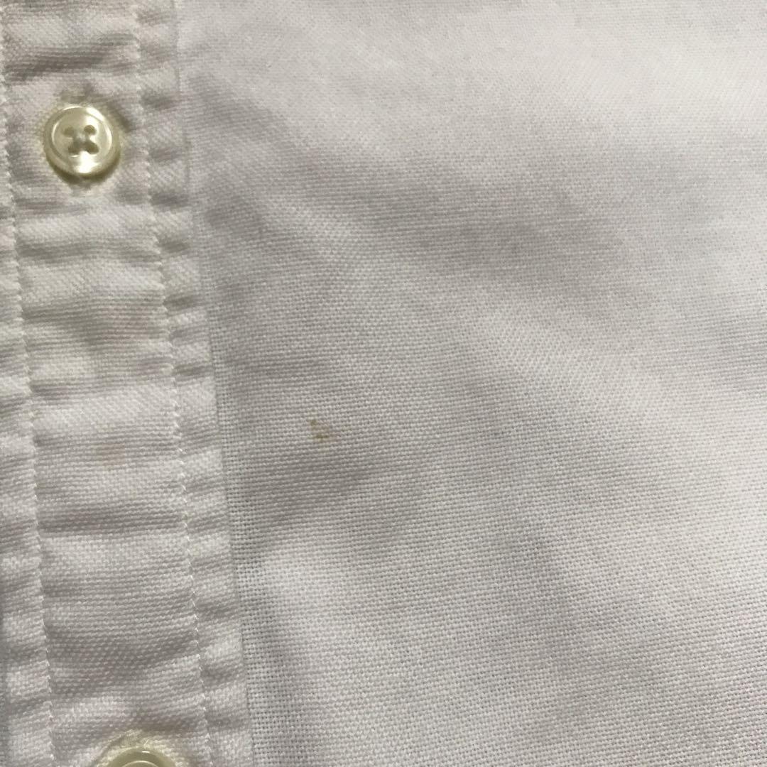 上からボタン4個目と5個目の中間くらいの位置に、小さな茶色い汚れがあります。