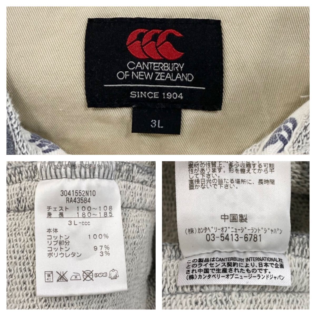 【CANTERBURY(カンタベリー)スウェットパーカー 刺繍ロゴ 裏パイル地 メンズ3L グレー系】