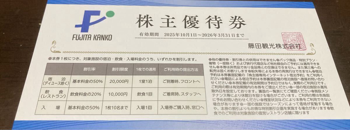 【★即決★配送選択】藤田観光株主優待券 1枚 ワシントンホテル 箱根小涌園ユネッサン 天悠 ほか 宿泊・入場50%OFF レストラン20%OFF 19