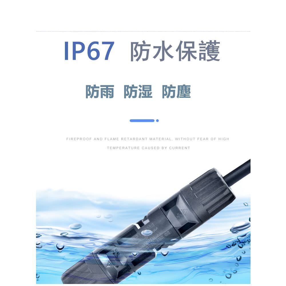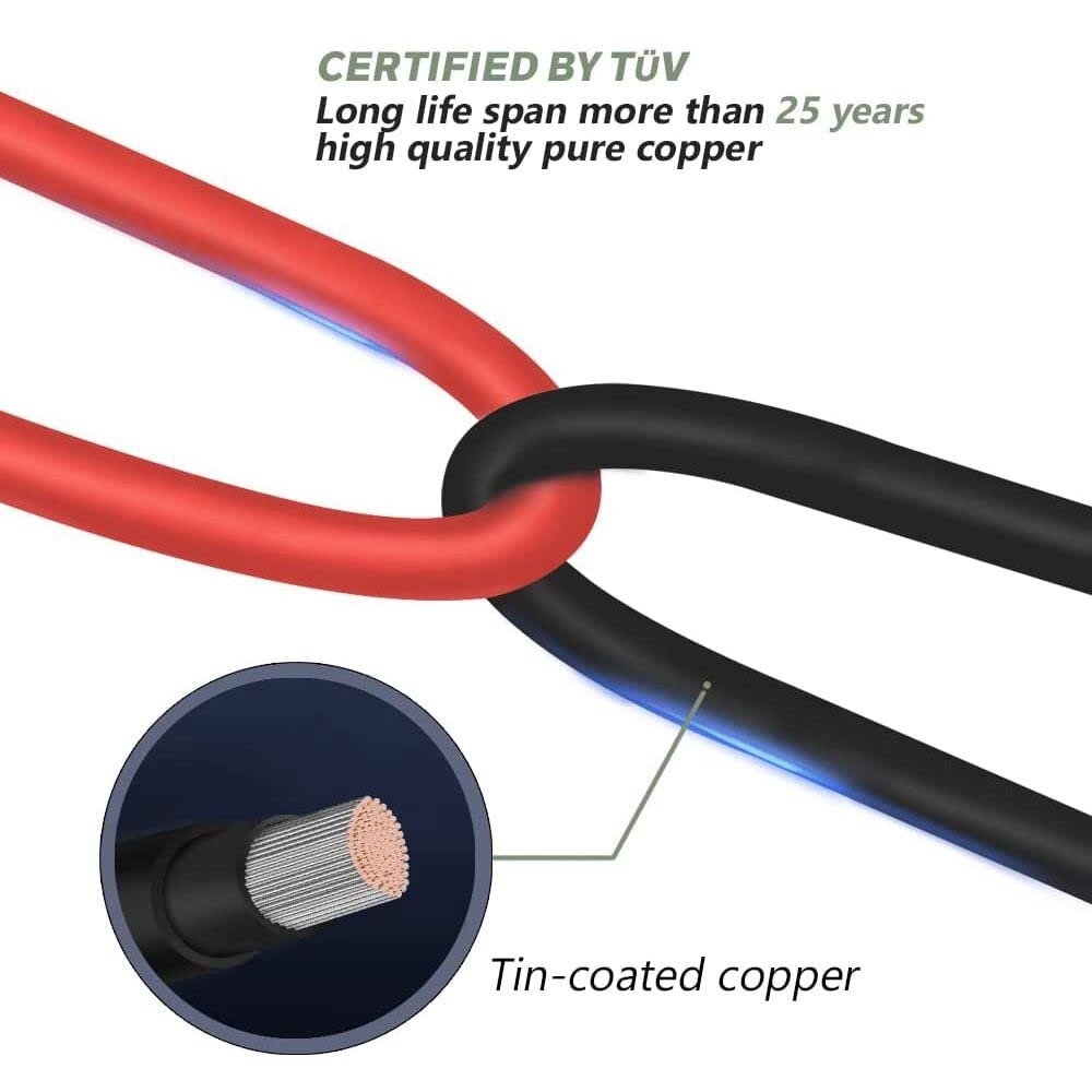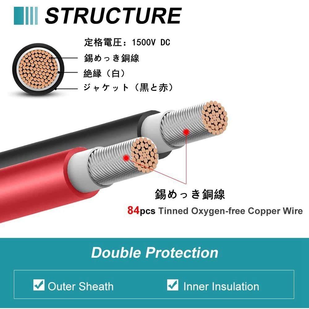 ケーブルは、太陽熱システムを含む応用に適したIP67防水&-30+90℃の作業温度、屋外で使えるために設計されており、湿気、UV、耐食性の抵抗に対して優れています。DIY、車載ケーブル、ソーラーパネルに接続に応用しております。【安全性】国際TUV認証取得.ご安心ください。