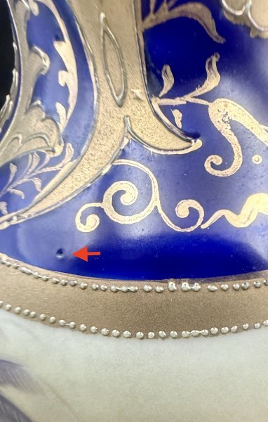 全体的には美しい状態ですが、口縁部にごく小さなチップと斑点があります。金粒装飾が一部欠けています。